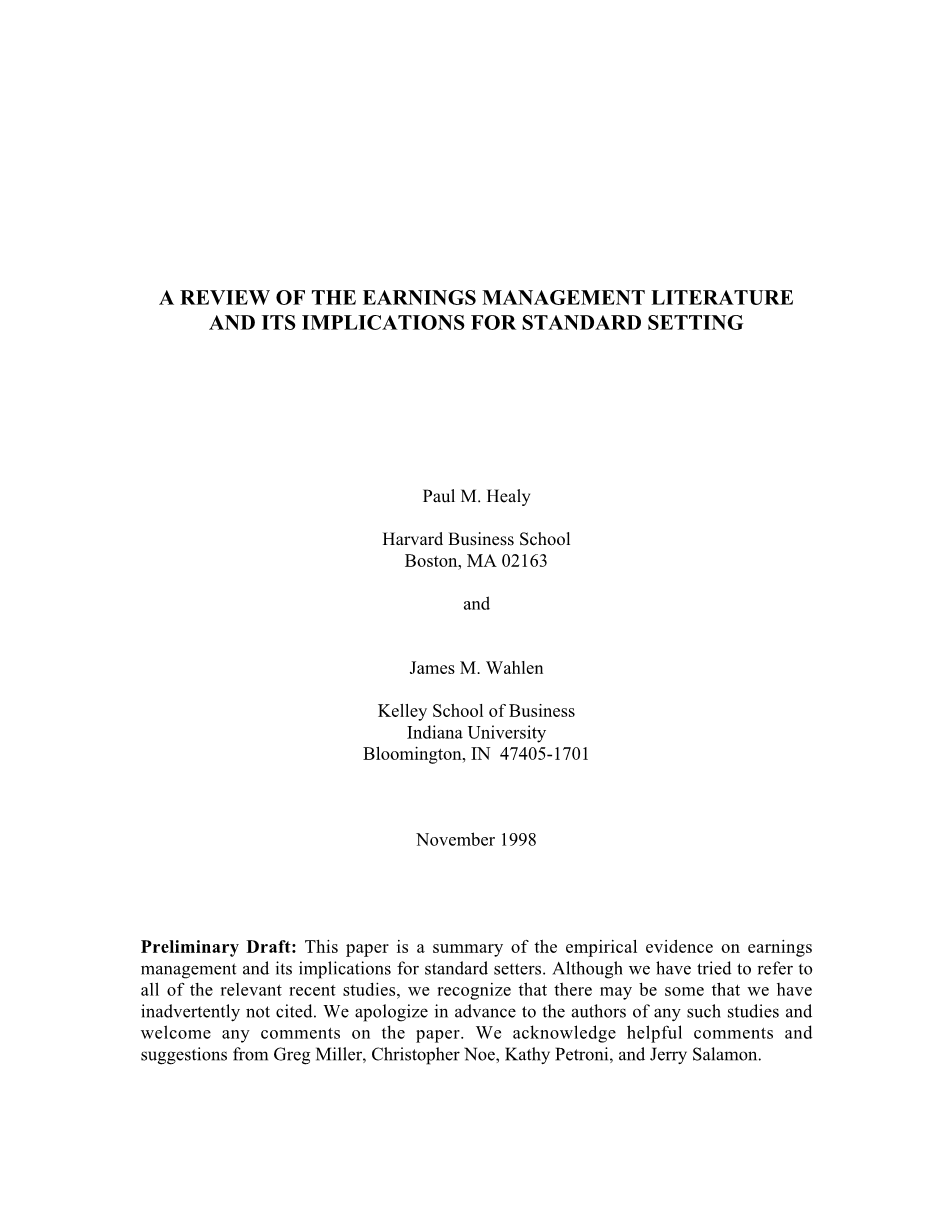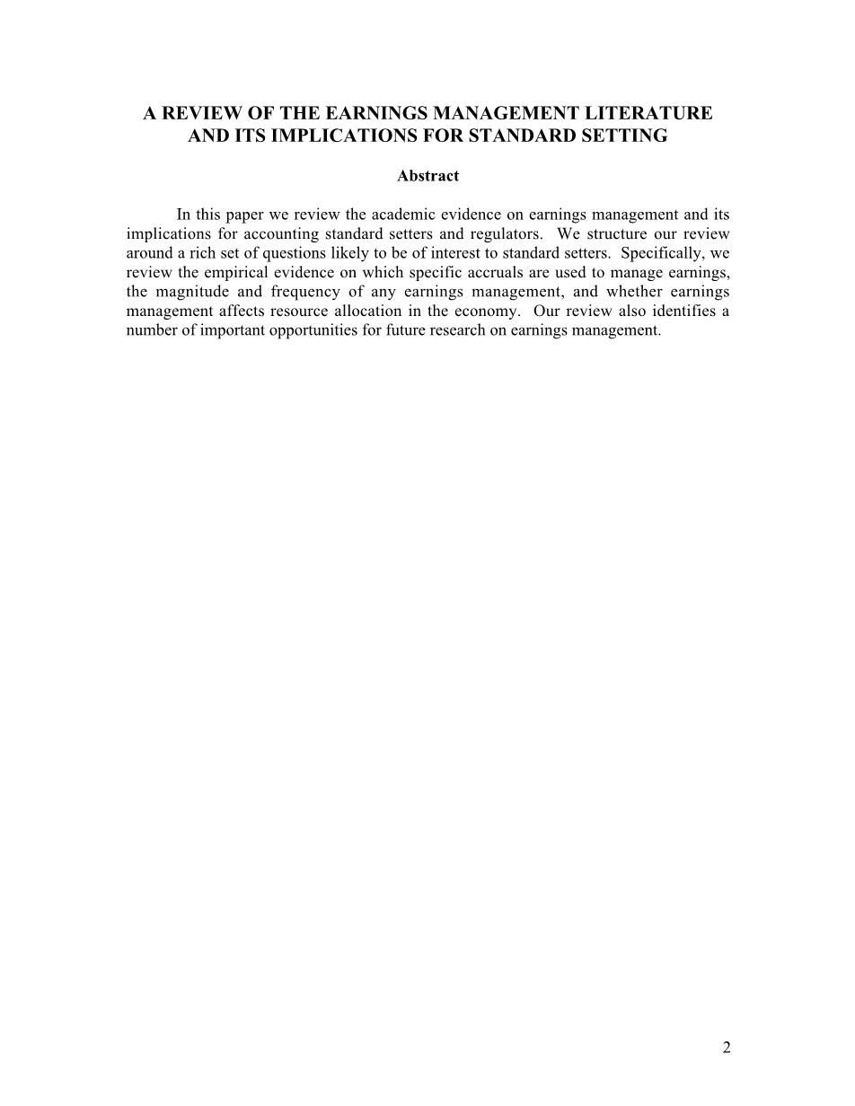 在本文中,我们回顾了盈余管理的学术证据及其对标准制定者的影响。 我们认为标准制定者的主要作用是定义管理层与公司外部利益相关者沟通的会计语言。会计准则通过开发可由独立审计师和证券交易委员会执行的语言,可为企业经理提供相对较低成本和可靠的方式,将私人信息传达给外部资本提供者和其他利益相关者。 财务报告使得经济中表现最好的公司能够将自己与表现不佳的企业区分开来,并促进利益相关方的有效资源分配和管理决策。