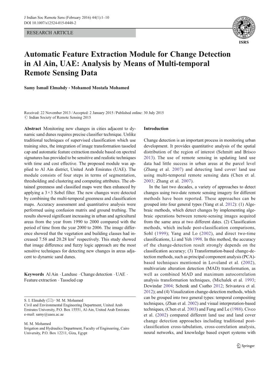 基于类别比较的分类后变化检测使用三个分类完成 1990-2000和2000-2006日期的图像。 1990年 和2000个分类图像组合在一起, 导致十个变化检测类。 然后,对每个分类图像进行精度评价 使用混淆矩阵和比较分类 J印度Soc遥感(2016年2月)44(1):1-10 3与地面真相信息和土地覆盖的Al 艾因市。 在每种情况下,总精度,生产者和 用户精度,卡帕系数,混淆矩阵等 报告了佣金和遗漏的错误 (Congalton 1991)。 分类图被校正 视觉上,使用高分辨率Quickbird图像和 选定地点的现场调查。