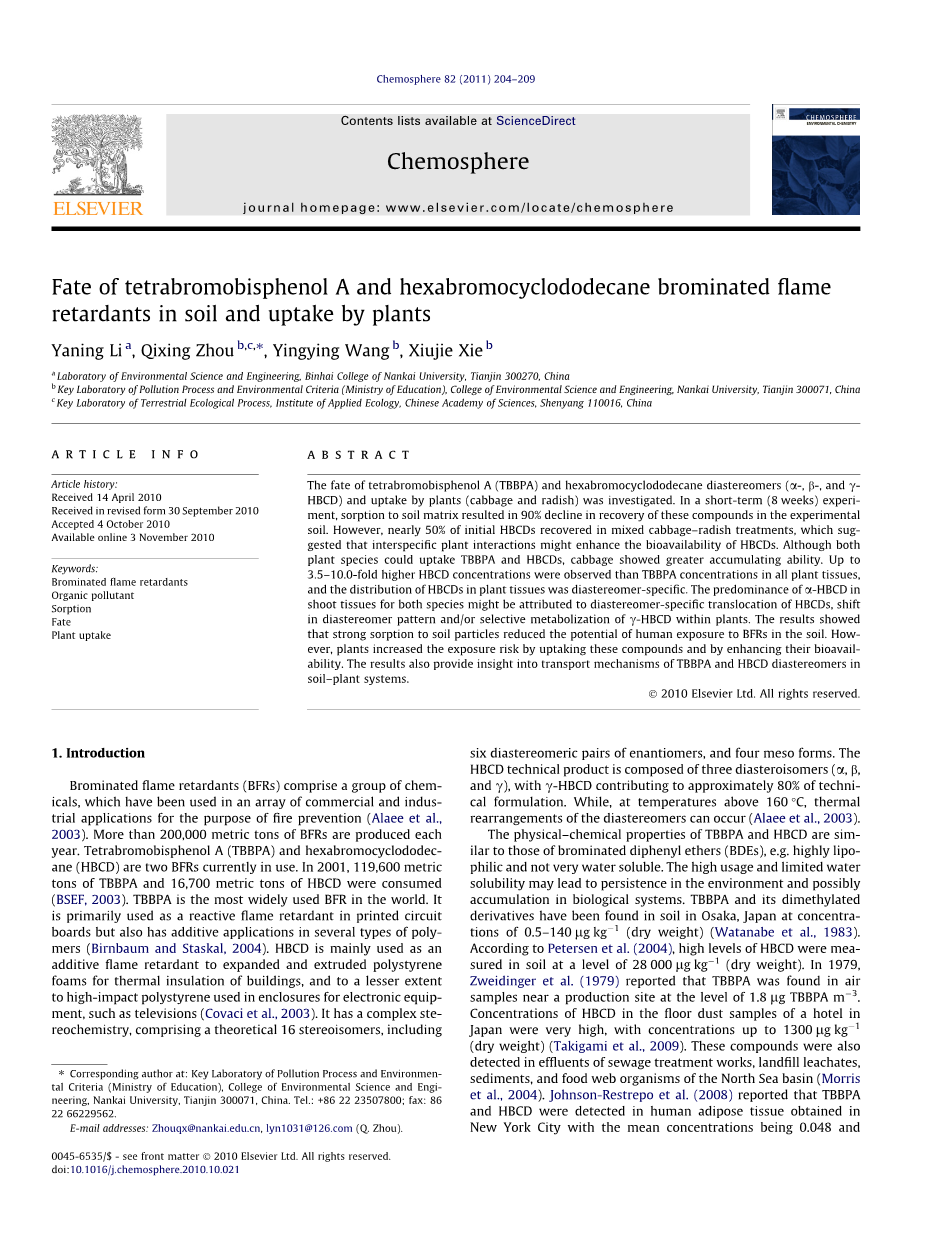 TBBPA和HBCD的物理-化学特性与溴化二苯醚(BDEs)是相似的,例如,高度亲脂性,而不是非常溶于水。高使用率和有限的水溶解度可能会导致在环境中的持久性,并可能在生物系统中积累。TBBPA和其甲基化衍生物已在土壤中在日本大阪被发现浓度为0.5-140mu;g kg-1(干重)(Watanabe等人,1983)。根据Peterson等人的研究(2004),高含量HBCD的土壤中,测定等级是28000mu;g kg-1(干重)。1979年,Zweidinger等人(1979)报道称,在附近的一个生产基地的TBBPA空气样品中发现了1.8 mu;g TBBPA m3的水平。在日本酒店的地板上灰尘样本中HBCD的浓度非常高,其浓度高达1300mu;g kg-1(干重)(Takigami等,2009)。在污水处理厂的污水中,垃圾填埋场渗沥液中,沉积物中,和北海流域的生物食物网中也发现了这些化合物(Morris等人,2004)。Johnson-Restrepo等人(2008)报道称,TBBPA和HBCD在纽约市人脂肪组织分别检测获得的平均浓度为0.048和0.333 mu;g kg-1(脂肪重量)。TBBPA和HBCD在各种基质的检测提醒我们关注潜在的环境问题。TBBPA是一种细胞毒素,免疫毒性物,甲状腺激素激动剂,并有可能破坏雌激素信号的潜力(Meert等人,2001;Kitamura等人,2002;Mariussen和Fonnum,2002;Reistad等人,2002;Pullent等人,2003年)。对甲状腺稳态中断被显示为TBBPA的主要毒性作用,因为TBBPA结合关键血清转运蛋白的TTR有与T4竞争的可能性。然而,HBCD可以扰乱甲状腺激素系统并诱导哺乳动物细胞中的遗传改变(Helleday等人,1999年)。HBCD也已显示阻断多巴胺摄取到体外大鼠脑突触体,该结论支持HBCD有可能导致神经行为改变的潜在性(Mariussen和Fonnum,2002)。 Eriksson等人(2002)报道,HBCD暴露于小鼠的早期新生儿导致其自发行为改变,学习和记忆的缺陷,降低烟碱受体的数量。尽管广泛的使用,但是关于TBBPA和HBCD在土壤中的归趋只存在有限的认知。尚未见报道的TBBPA和HBCD植物的影响,其中包括潜在的TBBPA和HBCD吸收和转运到地上的组织。对于其它卤代持久性有机污染物(POPs),封存通过土壤组分(Krauss和Wilcke,2002),生物利用度(Morrison等人,2000),和生物降解(Davis等人,2005年)这是在土壤中的持久性的重要决定因素。在这项研究中,索氏提取是用来监测土壤中TBBPA和个别HBCD非对映体的回收,调查它们在土壤环境中的行为。白菜和萝卜它们在土壤中行为的影响也进行了研究。白菜是绿叶蔬菜和萝卜是根茎蔬菜,我们希望通过这两类蔬菜研究TBBPA和HBCD的吸收。