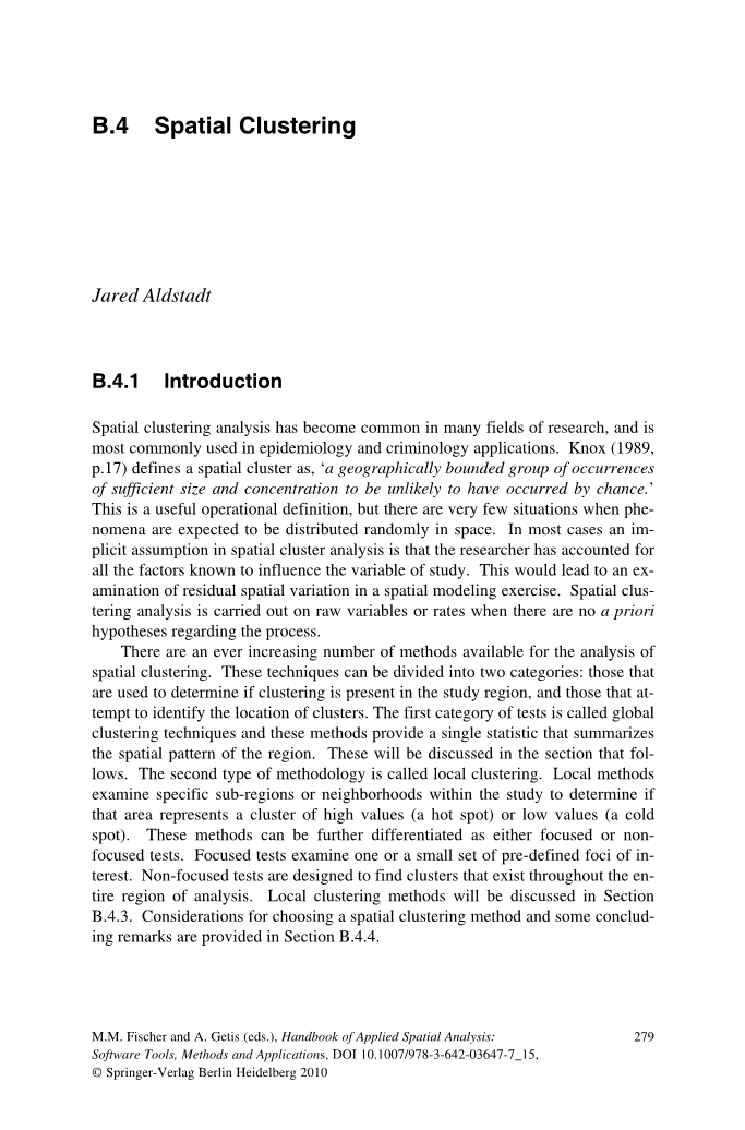 越来越多的方法可用于分析空间聚类。这些技术可以分为两类:那些用于确定研究区域中是否存在聚类,以及尝试聚类以识别集群的位置。第一类测试称为全局测试聚类技术和这些方法提供了一个总结的统计量该地区的空间格局。这些将在以下部分进行讨论。第二种方法称为局部聚类。局部方法检查研究中的特定子区域或社区以确定是否该区域表示高价值(热点)或低价值(感冒)的群集点。这些方法可以进一步区分为聚焦或非聚焦测试。聚焦测试检查一组或一小组预先定义的感兴趣的焦点。非集中测试旨在查找整个存在的集群分析区域。本章将讨论本地聚类方法在第3节中。选择空间聚类方法和一些结论的注意事项在第4节提供了结论。