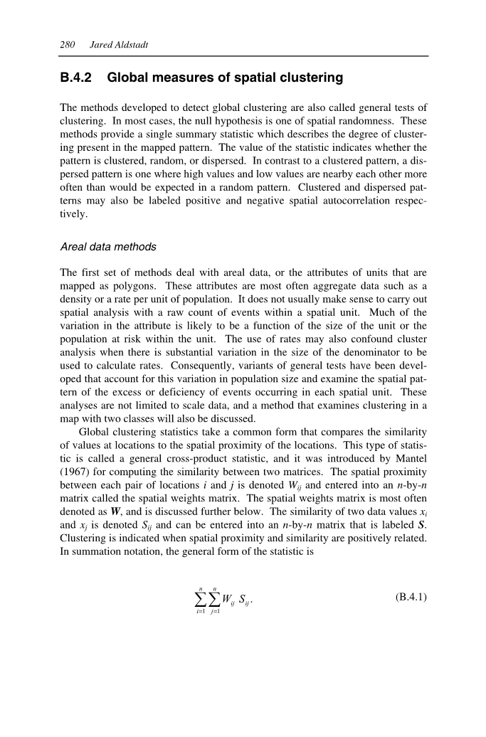 全局聚类统计数据采用一种通用形式来比较相似度的位置到位置的空间接近度的值。 这种统计数据被称为一般的交叉产品统计量,由曼德尔(Mantel,1967)介绍,用于计算两个矩阵之间的相似度。 空间接近在每对位置之间,i和j被表示为并输入n乘n矩阵称为空间权重矩阵。 空间权重矩阵是最常见的表示为W,并在下面进一步讨论。 两个数据值的相似度并且表示为,并且可以被输入到被标记为S的矩阵。当空间邻近度和相似度正相关时,就会指出聚类。总而言之,统计的一般形式是