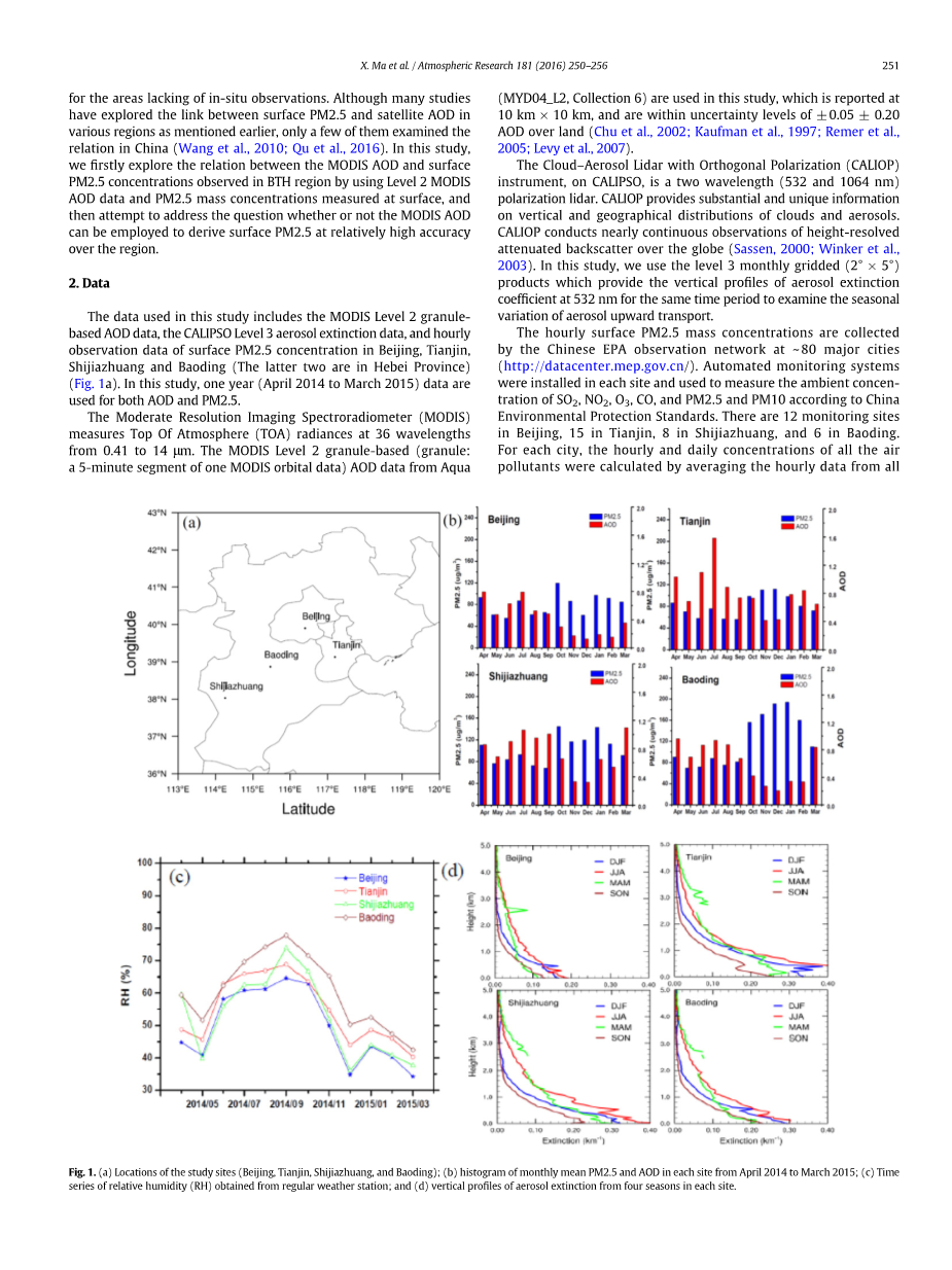 本研究中所用的数据包括北京,天津,石家庄和保定的MODIS 2级颗粒AOD数据,CALIPSO 3级气溶胶消光数据和表面PM2.5浓度的小时观测数据(后两者均为河北省)(图1a)。在本研究中,AOD和PM2.5都使用一年(2014年4月至2015年3月)的数据。