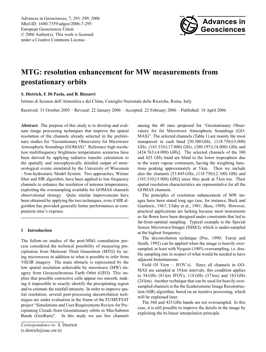 对于图像精度的研究被认为是增强第三代气象卫星测量降水技术的希望,通过微波探测不仅仅可以推断出可见光图像与红外图像,主要是可以由其强大的云穿透能力实现地球同步轨道微波的低空图像。这可能意味着对流层显得更加清晰,从而准确识别降水区和估计降雨强度。为了提高空间分辨率,进行了几个处理反褶积技术的框架下的“静止轨道云探测模拟”。在这项研究中我们用了多个通道。所选通道(表1)主要是最有代表性的在几组数据[50.300 GHz,(118.750plusmn;5.000)GHz,GHz(183.310plusmn;17.000),(380.197plusmn;18.000)GHz和(424.763plusmn;4.000)GHz]。所选频道的380GHz和425 GHz数据是为了大面积水蒸气聚集的低对流层,其权重函数峰值大约为5公里。然后我们还把通道[53.845 GHz,(118.750plusmn;2.100)GHz和(183.310plusmn;5.000)GHz]包含在内,因为他们的峰值达到5公里。他们的空间分辨率特征GOMAS通道的代表。