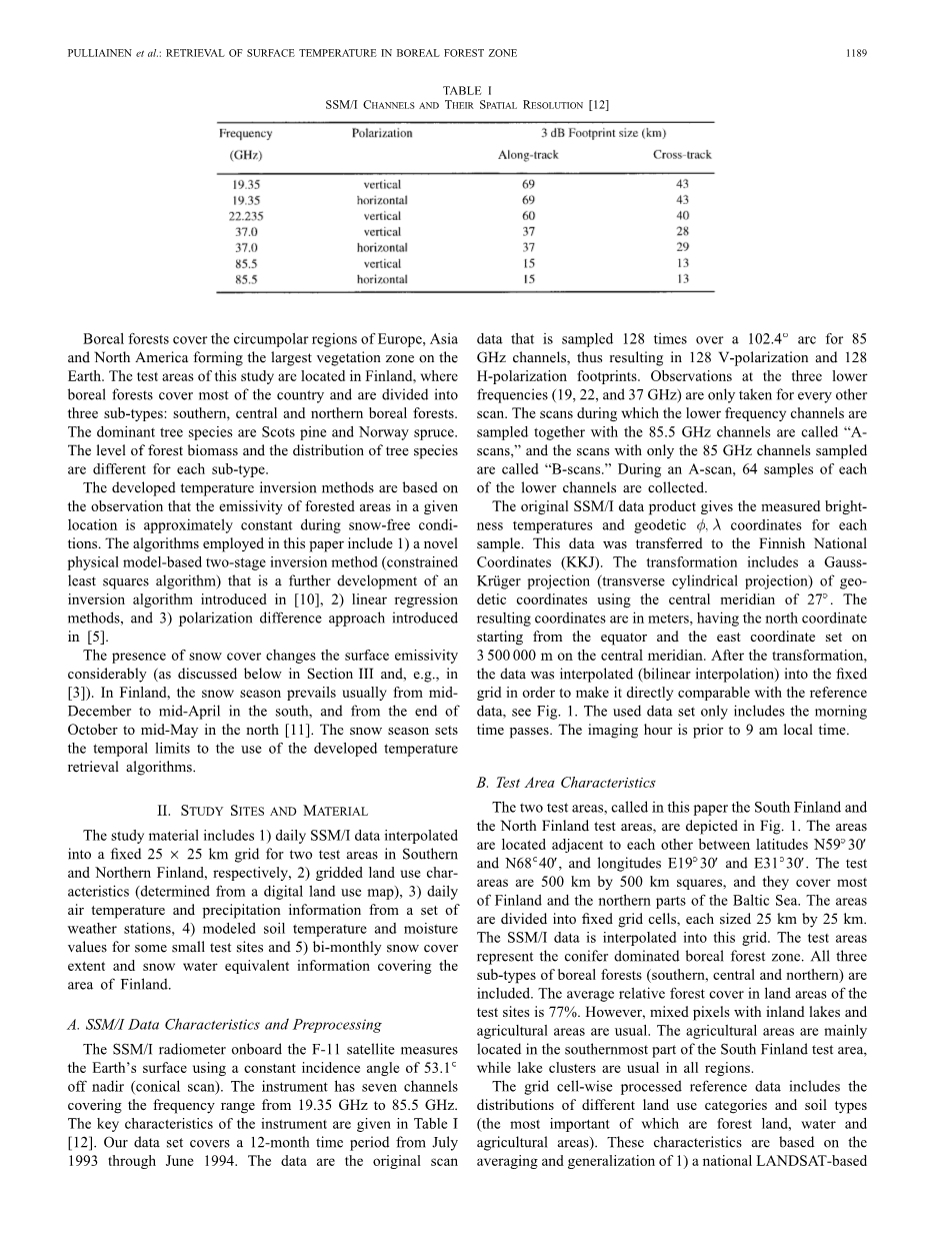 F-11卫星上的SSM/I辐射计从最低点以一个恒定的入射角53.1°探测地球表面(圆锥扫描)。该仪器具有七个通道,频率范围从19.35 GHz到85.5 GHz。表I是仪器的主要特征。我们的数据集包含了从1993年7月到1994年6月,共12个月的时间。数据是原始扫描数据,对85GHz的两个极化频率通道,在102.4°观测弧度中采样128次,从而形成128V-极化和128H-极化轨迹。三个较低的频率(19、22和37 GHz)作其他扫描。低频率和85.5HZ通道都采样的扫描成为A类扫描,只采样85GHz通道的扫描称为B类扫描。在A类扫描中,低频通道只采样64次。