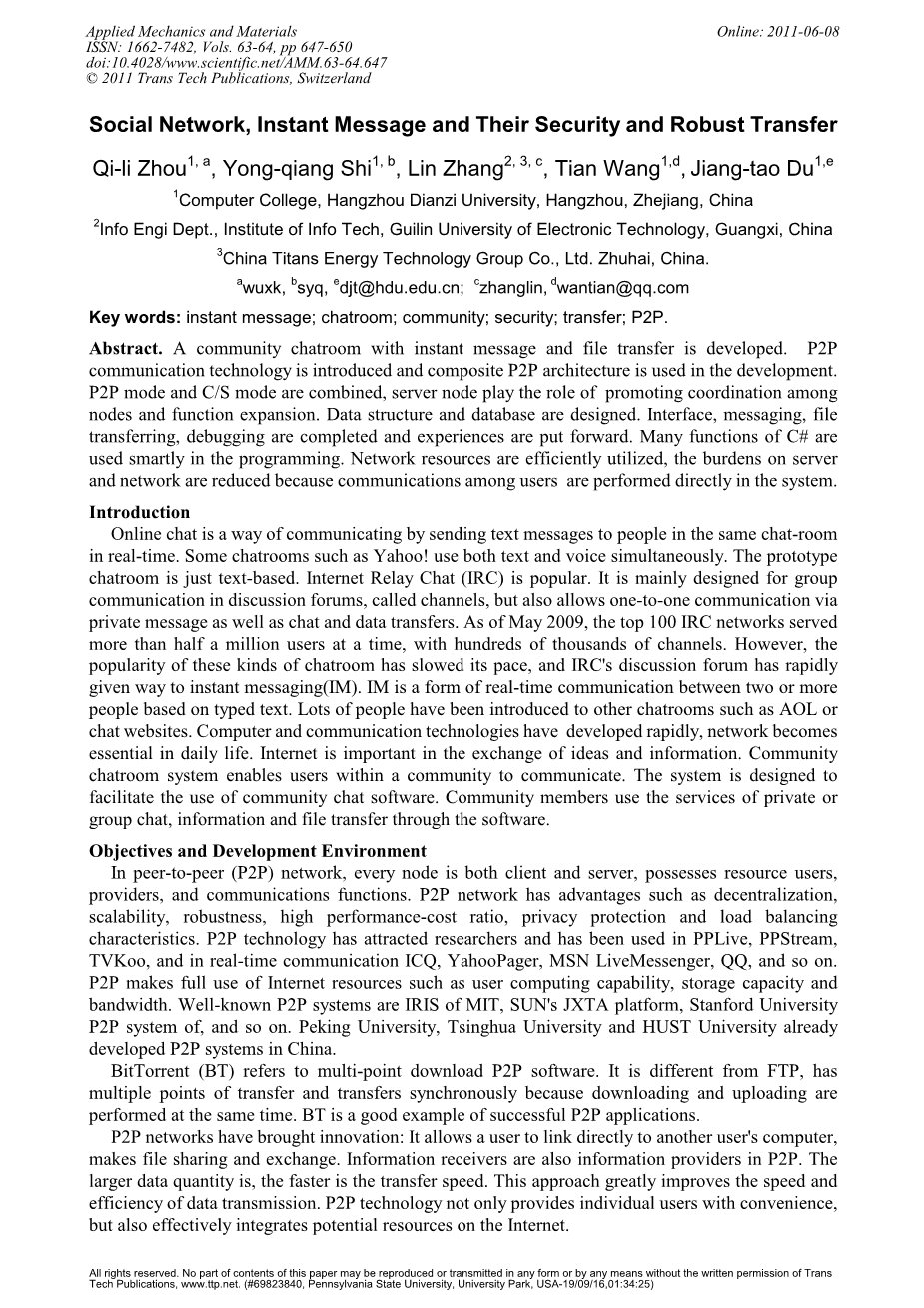 关键词:即时通讯; 聊天室; 社区; 安全; 传输;P2P
