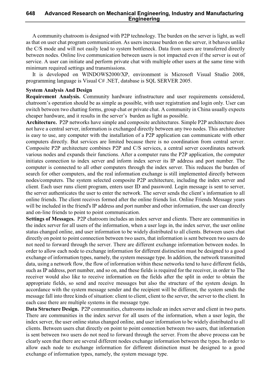 本文开发了一个集成了即时通讯和文件传输的社区聊天室。 本文介绍了P2P对等网络通信技术,并使用复合P2P架构完成了系统的开发。 P2P模式与C / S模式相结合,服务器节点起到促进节点间协调和功能扩展的作用。本系统设计了数据结构和数据库,同时完成了接口、通讯、文件传输的开发和系统的调试,并且提炼了系统开发经验。在系统编程中巧妙地使用了C#的许多内置函数。因为用户之间的通信直接在系统中执行,所以有效利用了网络资源,从而减少了服务器和网络上的负担。 未来的工作可能会包含:集成设计三维用户界面和设计对用户更加友好的操作。