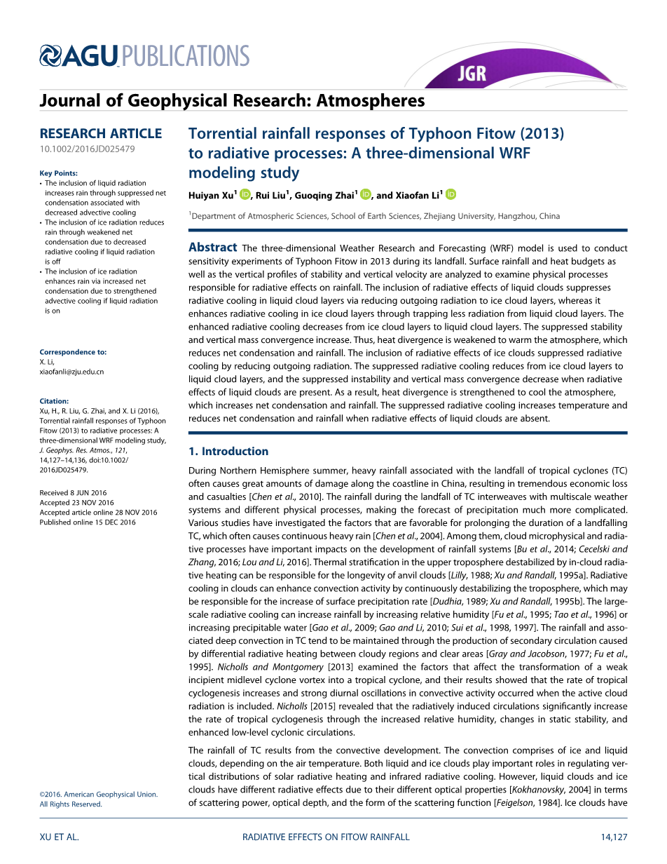 在北半球夏季,与热带气旋(TC)登陆相关的强降雨常常在中国沿海岸线造成大量破坏,造成巨大的经济损失和人员伤亡[Chen et al.,2010]。 TC登陆时的降雨与多尺度天气系统和不同的物理过程交织在一起,使降水预报更加复杂。各种研究已经研究了有利于延长登陆TC持续时间的因素,这通常会导致持续的大雨[Chen et al.,2004]。其中,云微物理和辐射过程对降雨系统的发展具有重要影响[Bu et al.,2014; Cecelski and Zhang,2016; Lou and Li,2016]。通过云内辐射加热不稳定的对流层上部的热分层可能是砧云持续存在的原因[Lilly,1988; Xu and Randall,1995a]。云中的辐射冷却可以通过不断破坏对流层的稳定来增强对流活动,这可能是造成地表降水率增加的原因[Dudhia,1989; Xu and Randall,1995b]。大规模辐射冷却可以通过增加相对湿度来增加降雨量[Fu et al.,1995; Tao et al.,1996]或增加可降水量[Gao et al.,2009; Gao and Li,2010; Sui et al.,1998,1997]。 TC中的降雨和相关的深对流倾向于通过阴天区域和清澈区域之间的不同辐射加热引起的二次循环的产生来维持[Gray and Jacobson,1977; Fu et al.,1995]。 Nicholls和Montgomery [2013]研究了影响弱初期中层旋风涡旋转变为热带气旋的因素,他们的结果表明,当活跃的云辐射包括在内时,热带气旋发生率增加,对流活动有强烈的昼夜振荡。 Nicholls [2015]揭示,辐射诱导的循环通过增加的相对湿度,静态稳定性的变化和增强的低水平气旋循环显着增加热带气旋发生的速率。