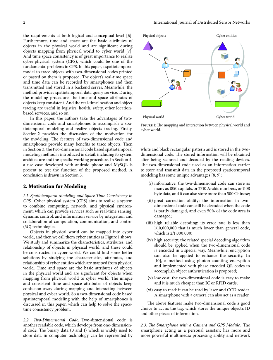人们对能够模拟随时间和空间变化的现象越来越感兴趣。Parent等人讨论了时空概念模型同时解决了时空建模问题,涵盖了逻辑和概念层面的需求[6]。此外,时间和空间是物理世界中物体的基本属性,在物体从物理世界映射到网络世界的过程中具有重要意义[7]。而时空一致性对于实现网络物理系统(CPS)具有重要意义,这可能是CPS的根本问题之一,本文提出了一种二维码打印或粘贴跟踪对象的时间-空间一致性模型。对象的实时空间和时间数据可以通过智能手机记录,然后传输并存储在后端服务器中。同时,该方法提供了时空数据查询服务,在建模过程中,对象的时空属性保持一致,实时定位和对象跟踪在物流、健康、安全以及其他基于位置的服务中都有很大的作用。