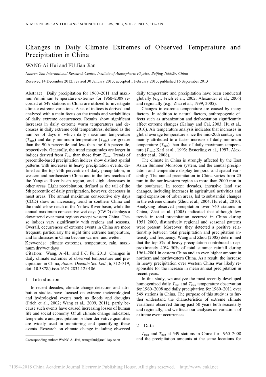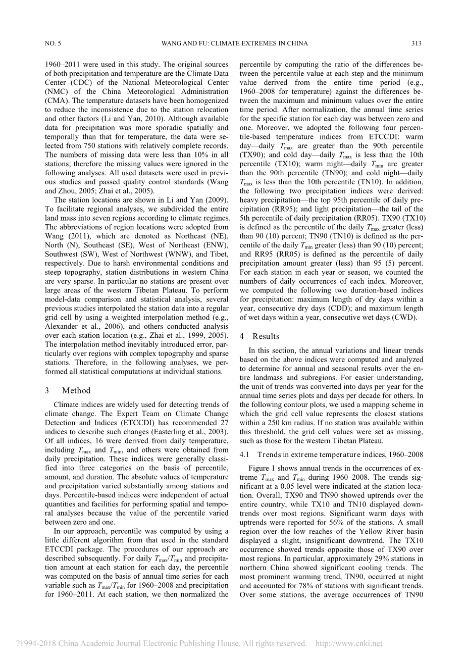 在这项研究中,我们分析了1960 - 2008年最近开发的均质日常T最小 和T最大 温度观测值以及1960 - 2011年中国549个站点的日降水量。本研究的目的是进一步了解过去50年来在季节和区域内观测到的极端气候变化的特征,并且我们将分析重点放在极端事件发生的变化上。