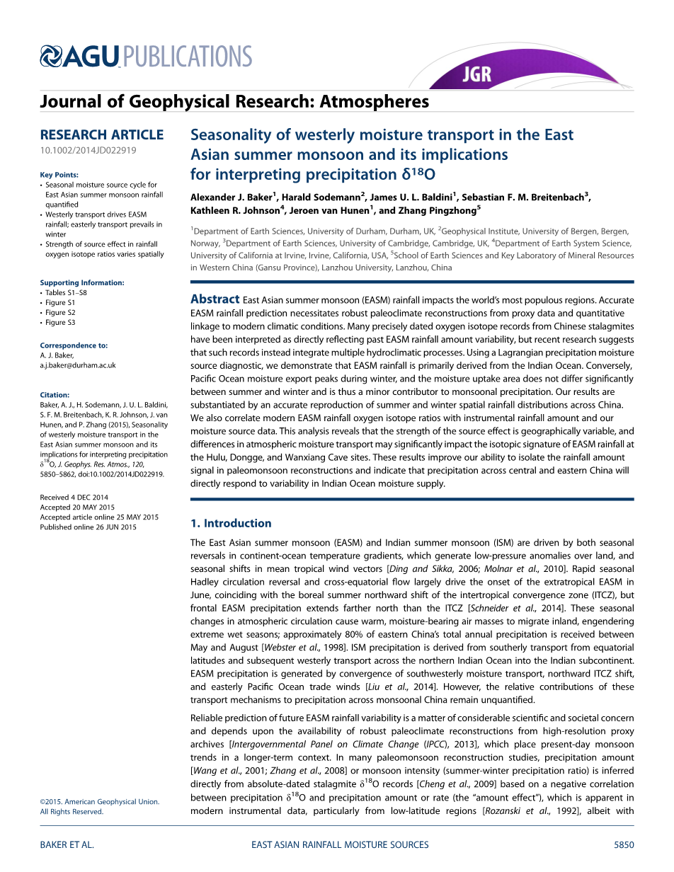 Alexander J. Baker1, Harald Sodemann2, James U. L. Baldini1, Sebastian F. M. Breitenbach3, Kathleen R. Johnson4, Jeroen van Hunen1, and Zhang Pingzhong5