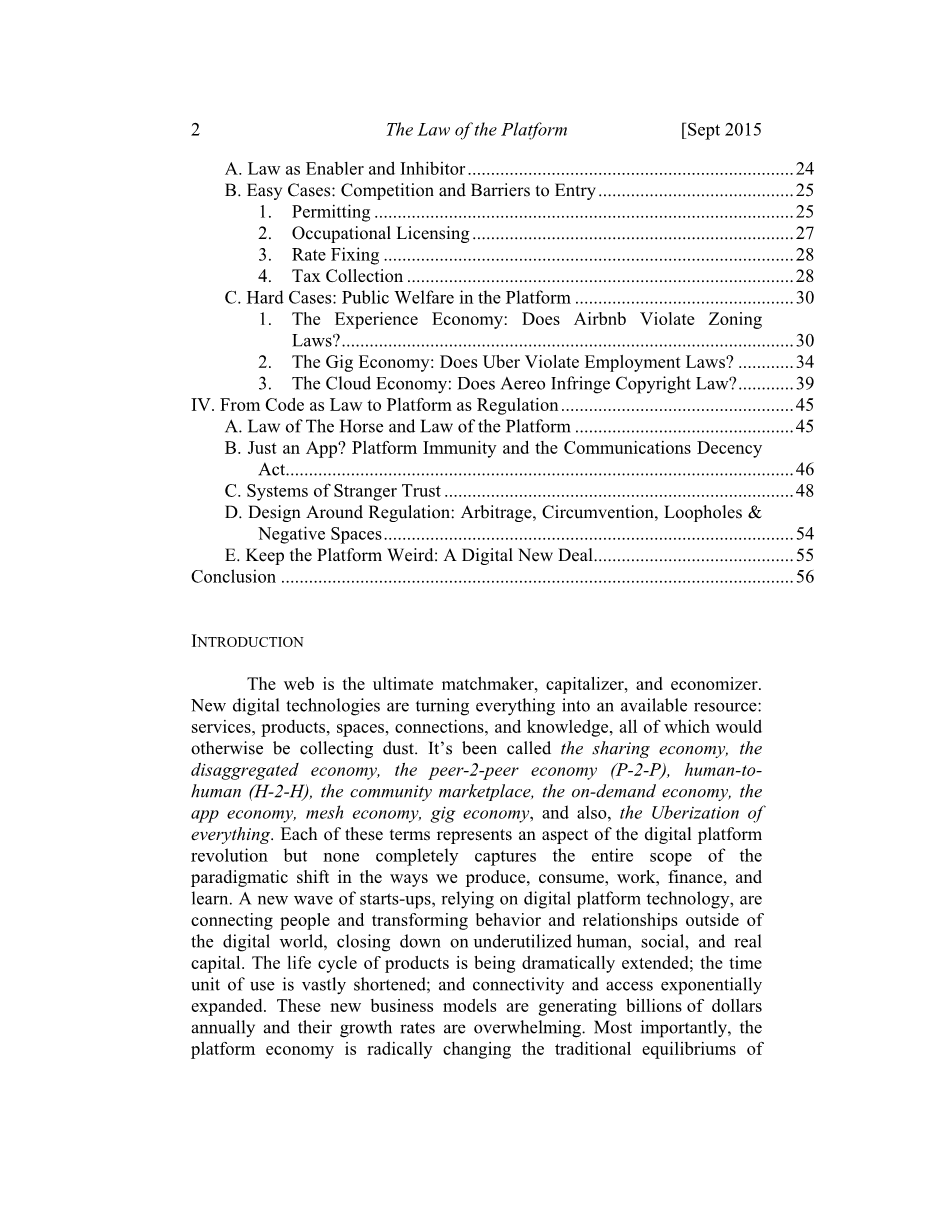 在过去几十年里,消费者保护法、安全和健康监管、企业许可和执照发放、房地产和分区法以及金融服务监管都大幅增加。这一激增的原因有好有坏,从安全目标和质量控制,到现任者游说的进入门槛等不那么温和的目标。这些法律机构都越来越与自下而上的在线平台发生冲突,后者提供了连接和交换的新模式。因此,本文提出了一个基础性的问题:我们所拥有的规则是否可以移植到平台经济中去?它揭示了受监管行业的内部逻辑如今受到数字平台企业挑战的方式。通过开箱经济社会驱动平台经济的兴起,本文发展一个新的框架要求数字是否中断包括漏洞和监管套利在税收领域,规避类似于有争议的版权保护改革,或innovation-ripe负空间类似于专利法的回避设计竞争。将这些不同的法律机构结合在一起,这篇文章对新商业模式的监管相关性提供了一个当代视角。这篇文章表明,平台经济带来的法律破坏通常应该被视为一种特性,而不是监管限制的缺陷。