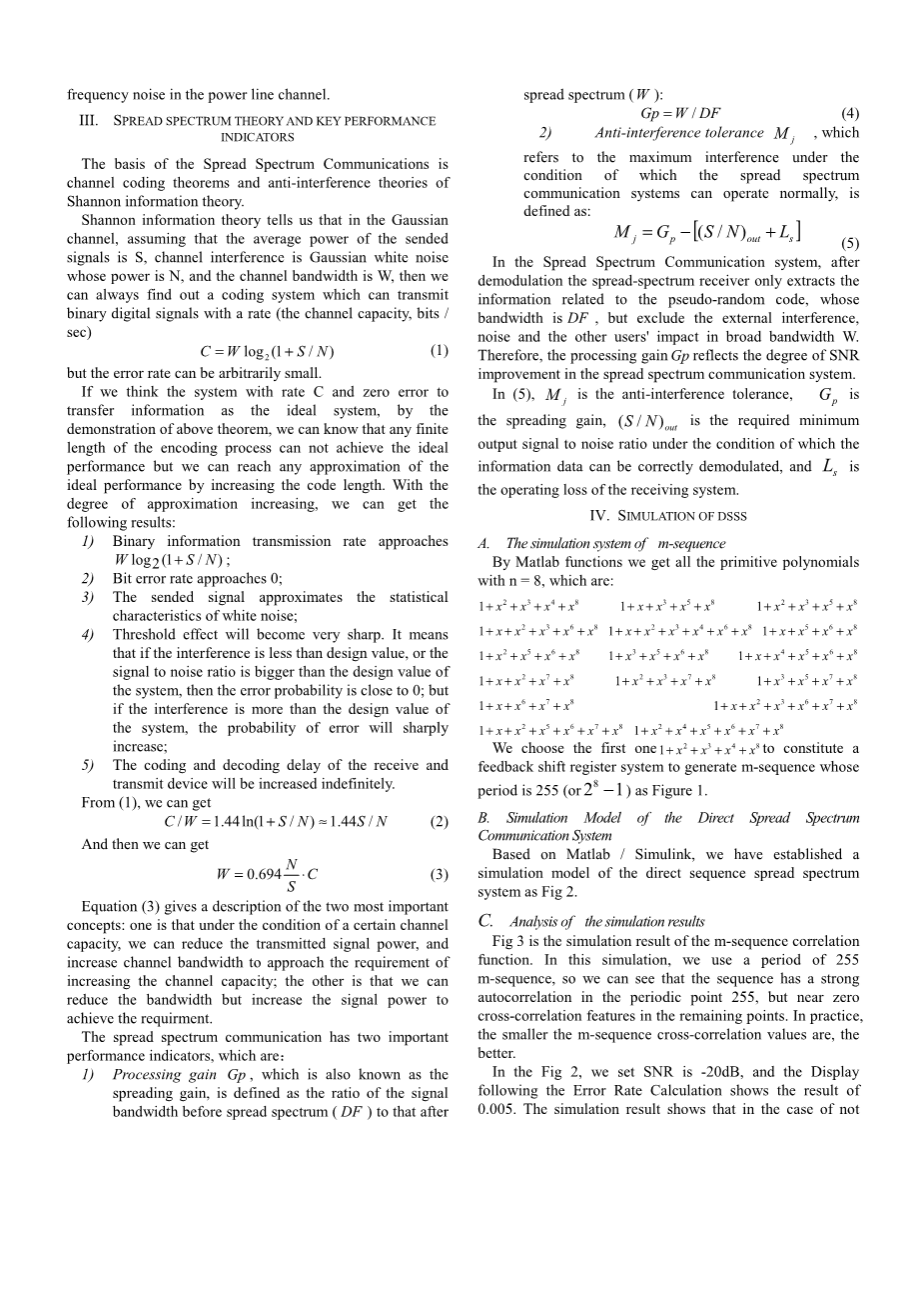 关键词:电力线通道特性;扩频;电力线通信;误比特率;模拟