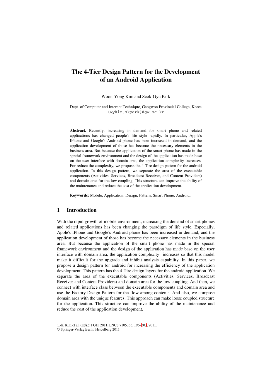 随着移动环境的快速发展,智能手机及相关应用的需求的增加已经改变了人们的生活方式。尤其,苹果的iPhone和谷歌的Android手机需求量不断增加,这些产品的应用开发已经成为商业领域的必备元素。但由于智能手机的应用是在特定的框架环境下进行的,应用的设计是基于区域的用户界面,应用的复杂性增加,使得该模型难以升级和抑制分析能力。在本文中,我们提出了一个Android的设计模式,以提高应用程序开发的效率。这个模式有用于Android应用程序的4轮胎设计层。我们将可执行组件(活动、服务、广播接收器和内容提供者)的区域和低耦合的域区域分开。然后,我们连接可执行组件和区域之间的接口类,并使用工厂设计模式来实现内容之间的流动。同时,我们还以其独特的特点组成了领域。这种方法可以使应用程序具有松散耦合的结构。这种结构可以提高维护能力,降低应用开发成本。