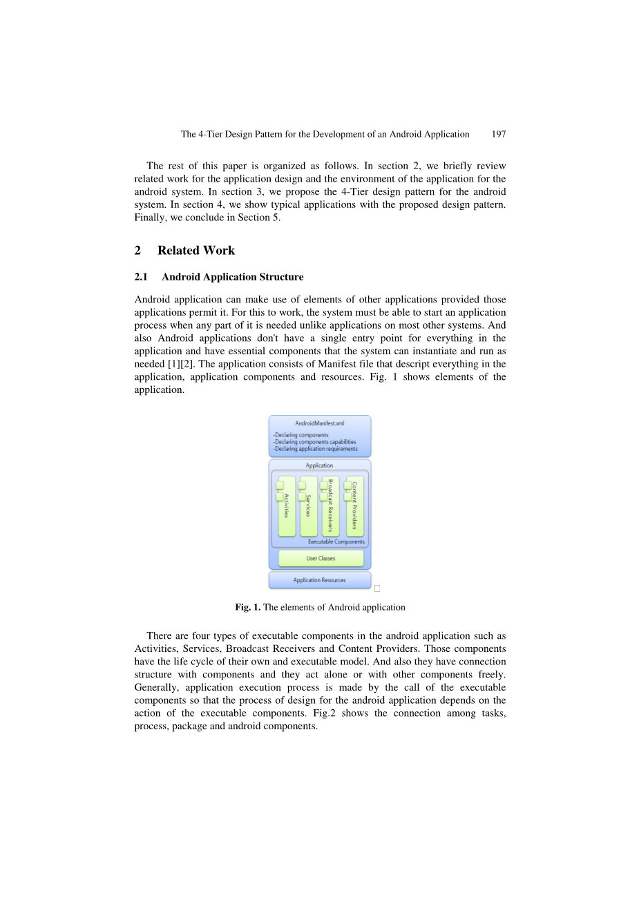 本文的其余部分组织如下。在第2节中,我们简要回顾了Android系统应用程序设计和应用程序环境的相关工作。在第3节中,我们提出了Android系统的4层设计模式。在第4节中,我们将展示具有所建议设计模式的典型应用程序。最后,我们将在第5节中结束。