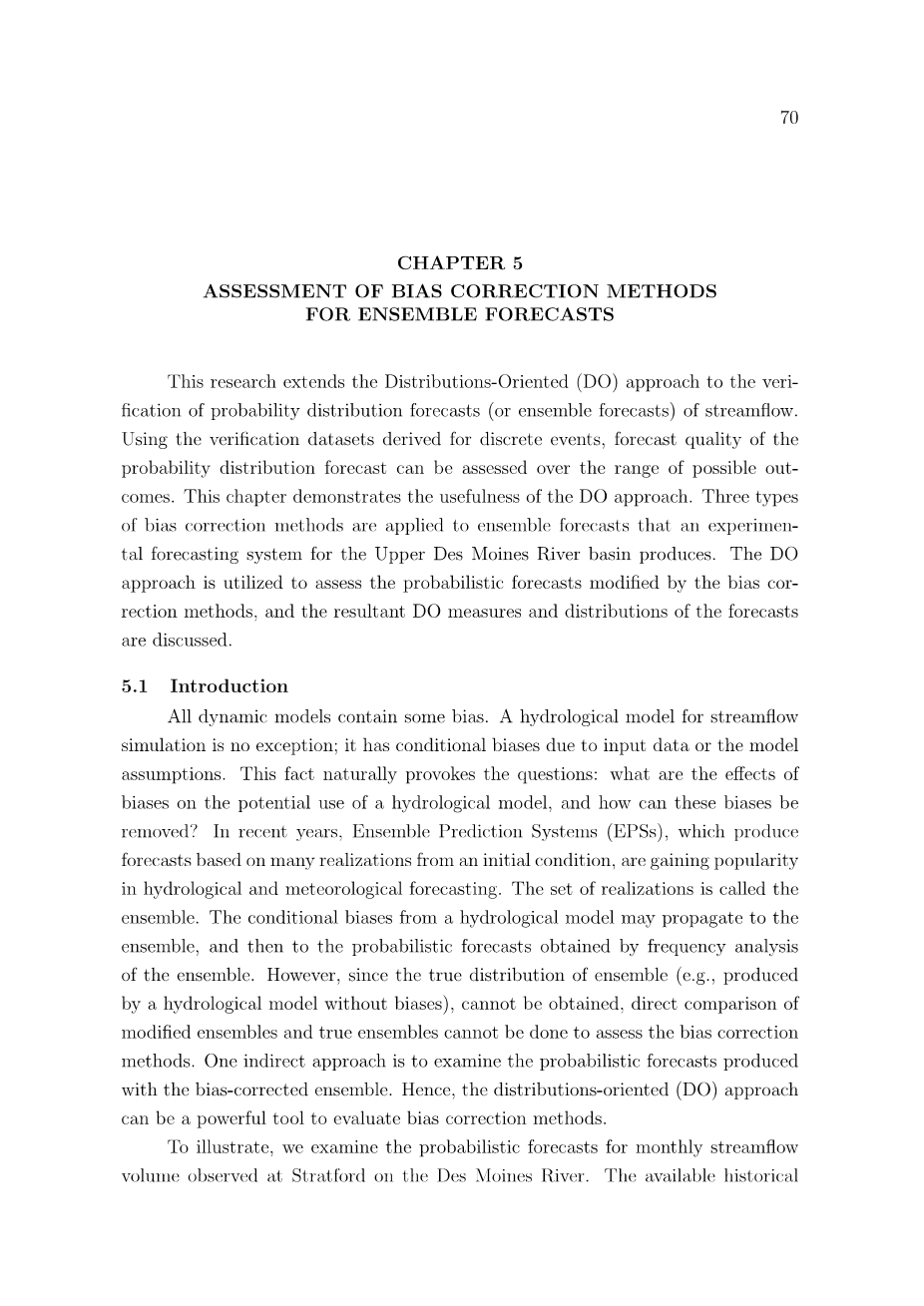 所有动态模型都包含一些偏差,模拟流量的水文模型也不例外。由于输入数据或模型假设时存在一定的误差,水文模型也就具有了偏差,这样的事实就引出了这些问题:偏差会对水文模型潜在用途造成什么样的影响?如何去除这些误差?近年来,基于在同一个初始条件下产生的多种预报结果来预报的集合预报系统(EPS)在水文和气象预报中越来越受欢迎。而这一系列的预报结果被称为一个集合。在这样的情况下,来自某一个水文模型的条件偏差可以传播到整个集合当中,然后再传播到由这个集合的频率分布得到的概率预报结果。然而,由于无法获得集合的真实分布情况(例如,这些集合都由没有偏差的模式产生),因此不能对改进的集合和真正的集合进行直接比较来评估偏差校正方法的优劣。一种间接的方法是检测检验基于去偏差集合的概率预报。因此,面向分布的(DO)方法可以成为评估偏差校正方法的有力工具。