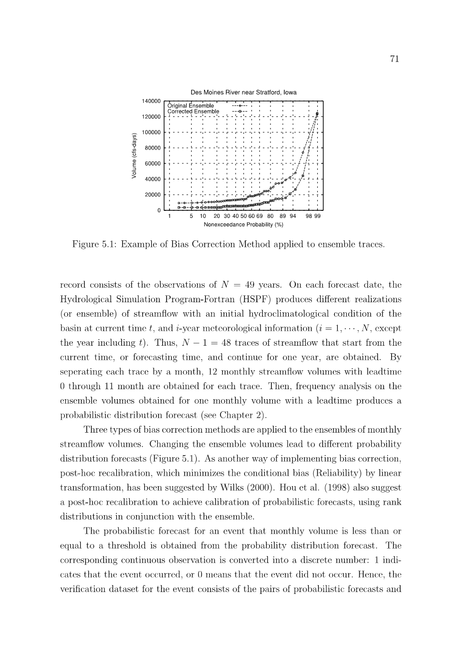 对集合(由每月流量构成)应用了三种偏差校正方法。改变整体体积会导致不同的概率分布预测(图5.1)。 作为实现偏差校正的另一种方式,Wilks(2000)提出了通过线性变换最小化条件偏差(可靠性)的事后重新校准。 侯等人(1998)还建议使用秩集合与集合进行事后重新校准以实现概率预测的校准。