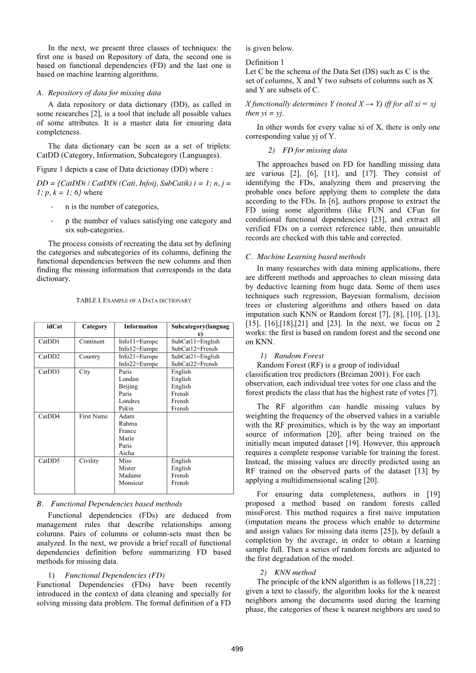 基于FD处理缺失数据的方法是多种多样的[2],[6],[11]和[17]。它们包括识别FD,分析它们并保留可能的FD,然后应用它们根据FD完成数据。在[6]中,作者建议使用一些算法(如条件函数依赖的目标函数和代价函数)[23]提取FD ,并在正确的参考表上提取所有经过验证的FD ,然后用该表检查不合适的记录并进行校正。