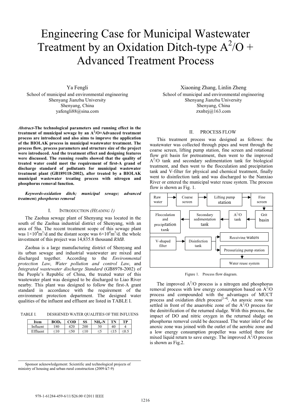 枣花是沈阳的一个大型制造区,其城市污水和工业废水混合在一起排放。根据“中华人民共和国环境保护法”,“水污染与控制法”和“污水综合排放标准”(GB8978-2002),该污水处理厂的处理水设计为排放到辽河附近。该工厂的设计符合环保部门要求的第一批A级标准。进水和出水的设计水质列于表I中。