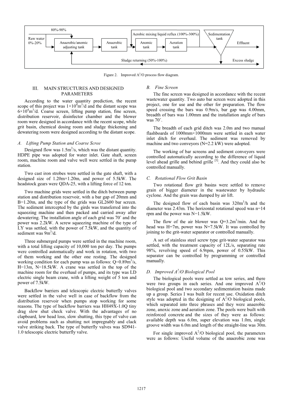 对于单个改良的A2/ O生物池,参数如下:厌氧区的有用体积为720m3 ,停留时间2.23h;有用的缺氧区体积为850m3 ,停留时间为2.68h;有氧区的有效体积为2850m3 ,停留时间为8.92h。污泥浓度为3150mg / L,污泥负荷为0.1kg.BOD5/kg.MLSS·d。在每个池中放置三个回流泵(两个用于制备的回流泵),每个泵的参数为Q = 3200m3 / h,H = 0.5m,N = 6.5kW。在每个水池中安装了四组低转向速度的插流装置,n = 55rpm,N = 5.0kW。在每个池中沉降六组潜水搅拌器,n = 98rpm,N = 3.0kW。安装了1980套微孔曝气头,曝气量为2-4m3/ h