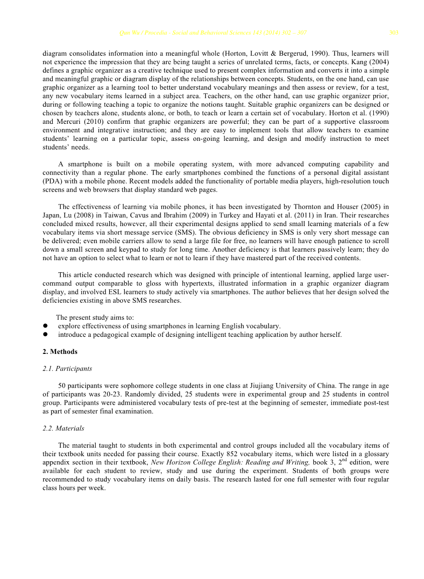 本文介绍了一个英语学习者主动使用智能手机学习英语词汇的教学实例。研究结果表明,智能手机的使用是中国大学生英语词汇构建的一种非常有效的方法。研究还表明,随着时间的推移,智能手机的使用在这些学生的词汇习得方面取得了成功的增长。然而,进一步的研究感兴趣的领域可以参考本研究样本量在较长一段时间的增加,或与其他示例参考类型的学生,比如高中生、有困难的学生、残疾学生(包括男生和女生),还有儿童和成人。此外,在应用其他小工具方面应该进行更多的研究。