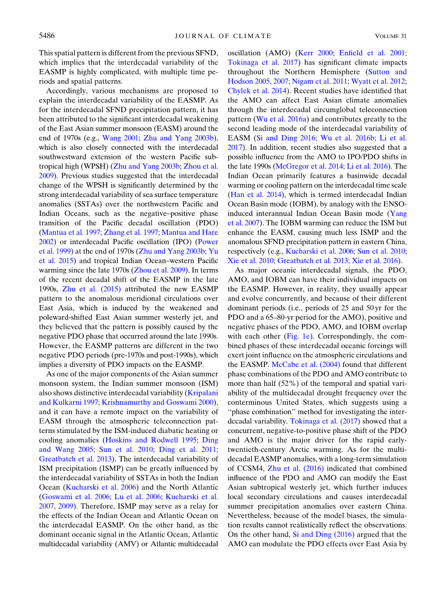 因此,各种解释东亚夏季风降水的年代际变化的机制被提出。至于年代际南方洪涝北方干旱的降水模式,主要是由于20世纪70年代末东亚夏季风的年代际减弱,同时也与西太平洋副高(WPSH)的年代际向西南延伸密切相关。此前的研究表明,西太副高的年代际变化很大程度上取决于西北太平洋和印度洋海表温度异常的强烈年代际变化,例如,在20世纪70年代末太平洋十年涛动(PDO)的负-正相关转变或者年代际太平洋振荡(IPO)和热带印度洋-西太平洋自20世纪70年代末以来变暖。从20世纪90年代末东亚夏季风降水的最近十年变化来看,新的东亚夏季风降水模式是由于东亚异常经圈环流引起的,这是由于东亚夏季西风急流减弱和向极地移动导致的,并且他们认为这种模式可能是由20世纪90年代后期出现的负PDO阶段造成的。然而,东亚夏季风降水模式在两个负PDO时期(20世纪70年代前期和90年代后期)是不同的,这意味着PDO对东亚夏季风降水的影响是多样的。