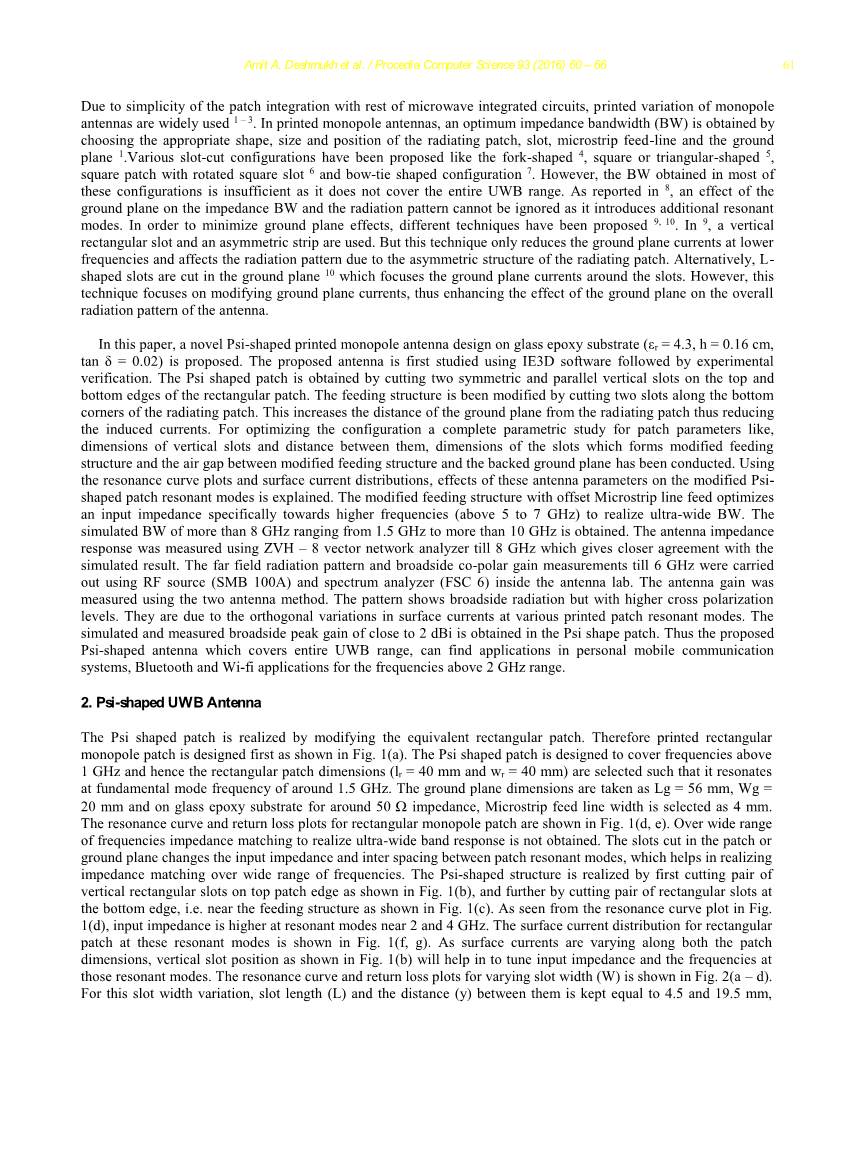 在本文中,提出了一种基于玻璃环氧树脂基板的新型Psi形印刷单极天线的设计(εr= 4.3,h = 0.16 cm,tandelta;= 0.02)。首先使用IE3D软件研究了所提出的天线,然后进行实验验证。通过在矩形补片的顶部和底部边缘上切割两个对称和平行的垂直槽来获得Psi形补片。通过沿辐射贴片的底角切割两个槽来修改进给结构。这增加了接地平面与辐射片的距离,从而减小了感应电流。为了优化配置,对贴片参数进行了完整的参数研究,如垂直槽的尺寸和它们之间的距离,形成改进的进料结构的槽的尺寸以及改进的进料结构和背衬的接地平面之间的间隙。使用共振曲线图和表面电流分布图,说明这些天线参数对修正的Psi形贴片谐振模式的影响。具有偏移微带线馈电的修改馈电结构优化了在更高频率(高于5至7 GHz)时天线的输入阻抗,以实现超宽带宽,从而获得了从1.5GHz到大于10GHz的超过8GHz的模拟BW。使用ZVH-8矢量网络分析仪测量天线阻抗响应,直到8 GHz,与模拟结果更接近。天线实验室内使用射频源(SMB 100A)和频谱分析仪(FSC 6),将远场辐射图和宽边同极增益测量至6 GHz。使用双天线方法测量天线增益。该图案显示宽边辐射,但具有较高的交叉极化水平。它们是由于各种印刷贴片谐振模式下的表面电流的正交变化。在Psi形状贴片中获得接近2 dBi的模拟和测量的宽边峰值增益。因此,提出的覆盖整个UWB范围的Psi型天线可以应用在2GHz以上频率的个人移动通信系统,蓝牙和Wi-Fi中。
