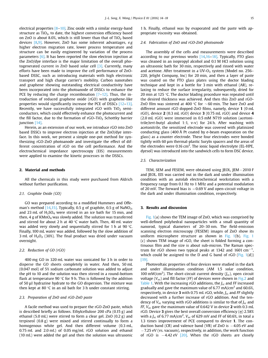 由于有限和不可再生能源的快速消耗,光伏电池得到了更多的关注和支持。特别是作为第三代太阳能电池的染料敏化太阳能电池(DSSC)由于其低电量,成本低,制造工艺简单,光电转换效率相对较高而吸引了很多科学和工业方面的研究兴趣[1-3]。在典型的器件中,电子由单层染料分子产生,然后在太阳照射下注入到半导体光电阳极[2]。随后,载流子在相互连接的纳米颗粒之间扩散,最后由F掺杂的SnO2(FTO)电极收集。显然DSSC中的半导体材料是电池性能的关键因素,这取决于电子传输的作用。到目前为止,广泛的研究表明,DSSC的性能主要受以下关键因素的影响:(i)从激发染料到半导体的电子注入;(ii)染料的光收集;(iii)电极的电子收集[4-7]。二氧化钛和氧化锌目前广泛用作光电阳极材料,因为它们具有独特的电性能[8-10]。氧化锌与二氧化钛具有类似的能带结构,迄今为止,基于ZnO的转换效率最高为8.0%,仍低于基于TiO2的器件[8,9]。然而,ZnO具有一些固有的优点,例如较高的电子迁移速率,较低的工艺温度和结构可以通过工艺参数的变化来轻松设计[6]。据报道,在ZnO/染料界面处的慢电子注入是ZnO基太阳能电池中总的光生电流的主要限制[3]。目前,为提高ZnO基DSSC的电池性能,已经做出了许多努力,如引进高电子传输和高电荷载流子迁移率的材料。碳纳米管和显示出优异导电性的石墨烯已被掺入到DSSC的光电阳极中,以通过减少电荷重组来增强PCE [7-12]。因此,引入具有石墨烯性质的还原型石墨烯氧化物(rGO)将显着增加DSSC的PCE [12-13]。最近,我们已经成功地将rGO与TiO2半导体合成,由于形成了rGO-TiO2肖特基势垒结,这可以有效地提高光电流和填充因子[14]。