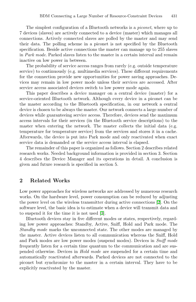 大多数关于微网络通信的研究重点是根据流量来估计优化轮询方案。他们可以利用嗅觉模式或者保持模式。我们不知道任何考虑蓝牙驻留模式以降低功耗的研究。