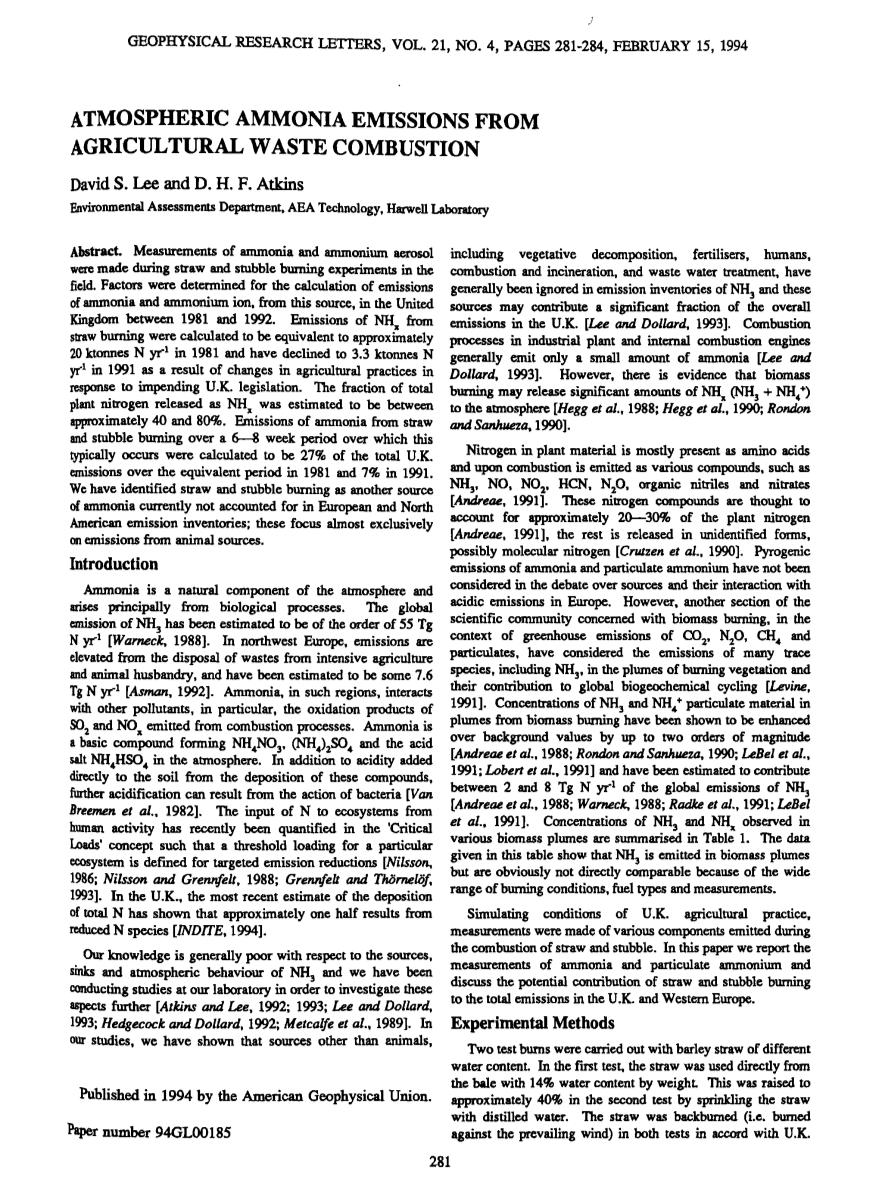 模拟英国农业实践条件,对秸秆和残茬燃烧过程中排放的各种成分进行了测量。在本文中,我们给出了氨和颗粒铵的测量结果,并讨论了秸秆和残茬燃烧对英国和西欧总排放量的潜在贡献。