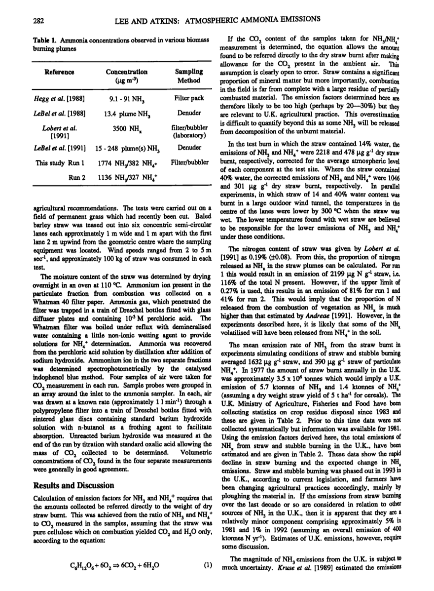 如果确定了用于测量NH3或NH4 样品中二氧化碳的含量,该方程在了考虑环境空气中存在的CO 2后,直接将所发现的CO2含量与燃烧干秸秆的CO2含量挂钩。这一假设显然容易出错。秸秆含有很大比例的矿物质,但更重要的是,田间燃烧远未完成,有大量部分燃烧的物质残留。因此,这里确定的排放因子可能太高(也许高20 - 30 % ),但它们与英国农业实践相关。除此之外,这种高估很难被量化,因为一些氨会从未燃烧物质的分解中释放出来。