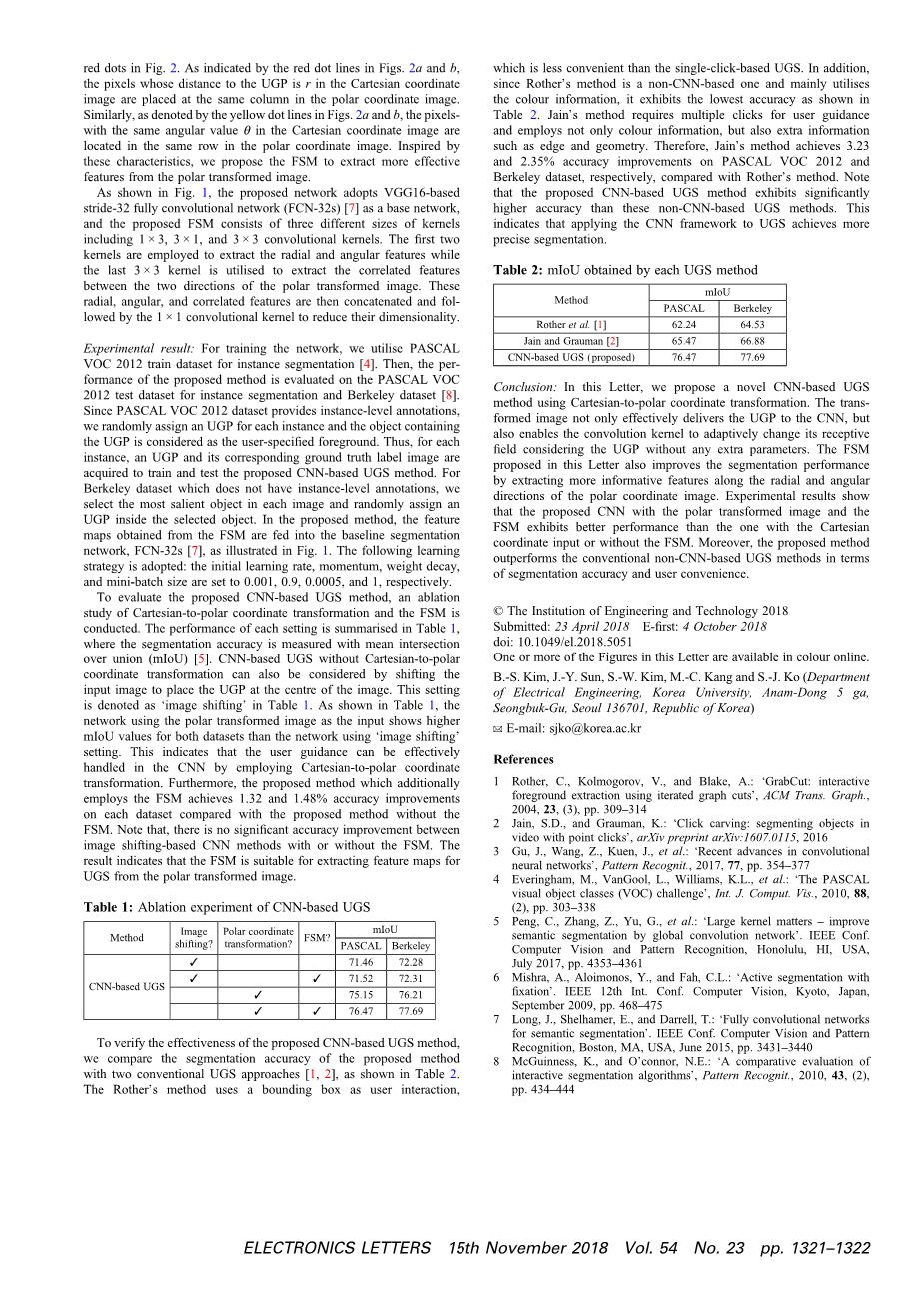 要将CNN框架应用到UGS中,需要对CNN进行训练,考虑到用户导航点(UGP)的先验信息,只需单击一下鼠标即可指定。为此,我们提出了一种新的基于cnn的基于极坐标变换的UGS方法。在该方法中,首先将输入图像以UGP为原点转换成极性变换后的图像。应用于极性变换图像的卷积核可以有一个接收域,接收域的大小根据内核中心到UGP的距离自适应地改变,使得提取高层上下文特征时不需要任何额外的参数。然后引入特征选择模块(FSM),利用该模块对极坐标图像的径向或角向像素点进行特征提取。为了训练所提出的UGS网络,我们使用PASCAL VOC 2012实例分割数据集和在每张图像中随机选择的UGPs。实验结果表明,采用极坐标变换后的神经网络和有限状态机比采用直角坐标输入的神经网络和不采用有限状态机的神经网络具有更好的性能。此外,该方法在分割精度上优于传统的非cnn方法,用户使用方便。