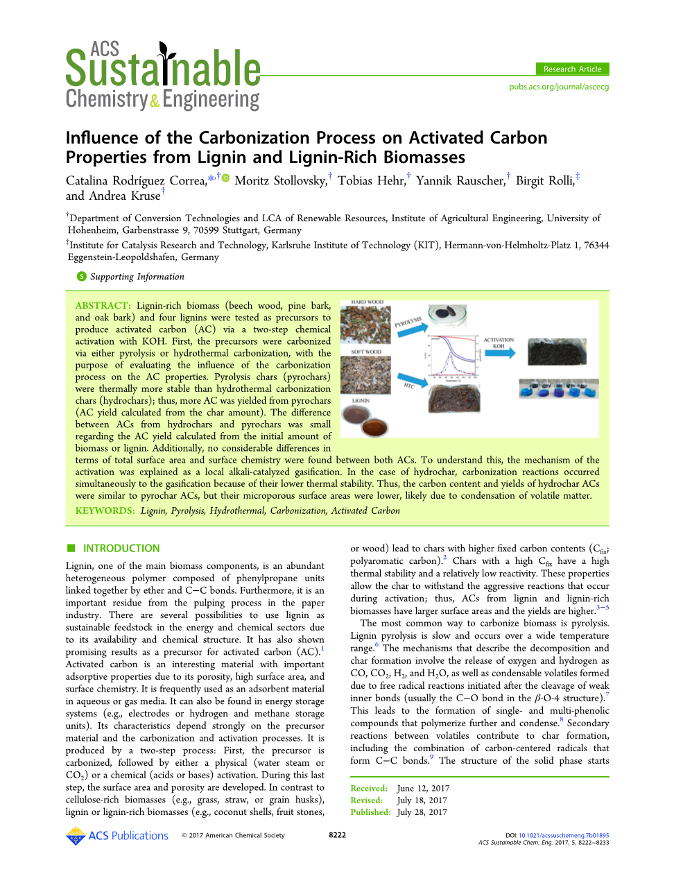 Abstract: Lignin-rich biomass (beech wood, pine bark, and oak bark) and four lignins were tested as precursors to produce activated carbon (AC) via a two-step chemical activation with KOH. First, the precursors were carbonized via either pyrolysis or hydrothermal carbonization, with the purpose of evaluating the influence of the carbonization process on the AC properties. Pyrolysis chars (pyrochars) were thermally more stable than hydrothermal carbonization chars (hydrochars); thus, more AC was yielded from pyrochars (AC yield calculated from the char amount). The difference between ACs from hydrochars and pyrochars was small regarding the AC yield calculated from the initial amount of biomass or lignin. Additionally, no considerable differences in terms of total surface area and surface chemistry were found between both ACs. To understand this, the mechanism of the activation was explained as a local alkali-catalyzed gasification. In the case of hydrochar, carbonization reactions occurred simultaneously to the gasification because of their lower thermal stability. Thus, the carbon content and yields of hydrochar ACs were similar to pyrochar ACs, but their microporous surface areas were lower, likely due to condensation of volatile matter.