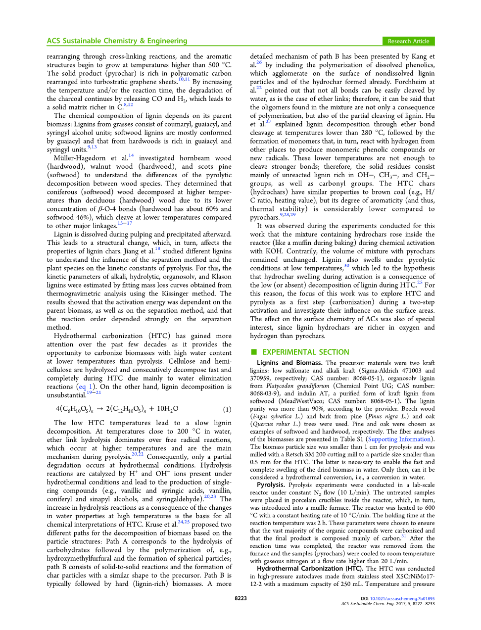 在为这项工作进行的实验中观察到,在用KOH进行化学活化的过程中,含有氢化物的混合物在反应器内上升(例如在烘烤过程中像一个混合物一样)。相反,与热解碳化混合物的体积保持不变。 木质素在热解条件下在低温下也膨胀,这导致了在活化过程中氢化物溶胀是水热碳化期间木质素低(或不存在)分解的结果的假设。出于这个原因,这项工作的重点是在两步活化过程中探索水热碳化和热解作为第一步(碳化)并研究它们对表面积的影响。活性炭的表面化学效果也特别令人感兴趣,因为木质素氢化物比氧化铁更富含氧和氢。