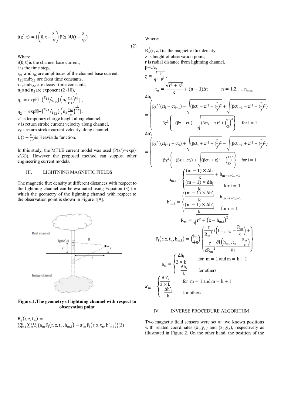 相对于闪电通道的不同距离处的磁通量密度可以使用方程(3)来计算,其中闪电通道相对于观测点的几何形状如图1[9]所示。