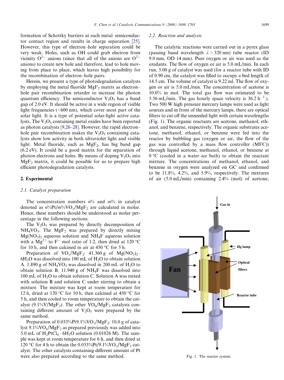 催化反应在耐热(Pyrex)玻璃(通带波长lambda;gt; 320nm)管式反应器(内径9.0mm,外径14mm)中进行。纯氧或空气被用作氧化剂(oxidants)。氧气或空气流量为5.0 mL/min。在每次运行中,使用5.00g催化剂(对于ID为0.90cm的反应管,填充催化剂以占据14.5cm的床长,催化剂体积为9.22ml,氧气或空气流量为5.0mL /分钟,丙酮的浓度(concentration)为10.0%(摩尔),总气体流量估计为5.56mL /分钟,气体时空速为36.2h-。使用两个500W高压汞灯作为光源,并且在汞灯前面,有滤光器来切断具有特定波长的不需要的光。(图1)。有机反应物分别是丙酮,甲醇,乙醇和苯。通过液体丙酮,甲醇,乙醇或苯通过鼓泡气体(氧气或空气,气体流量由质量流量控制器(MFC)控制)将有机基质丙酮,甲醇,乙醇或苯供入反应器 在0°(在水 - 冰浴中冷却)以获得反应物混合物。用GC分析甲醇,乙醇和苯中氧的浓度,结果分别为11.8%,4.2%和5.9%。 使用MFC和注射泵制备含有2.4%(摩尔)丙酮,0.53%苯和1.62%(摩尔)苯的空气混合物(5.0mL / min)。使用MFC将气体送入反应器的混合区,并使用注射泵将液体送入反应器的混合区。具有波长为lambda;gt; 320nm(503mW / cm2),lambda;gt; 380nm(305.9mW / cm2),lambda;gt; 520nm(170.1mW / cm2)和lambda;gt; 560nm(75.8 mW / cm2)用于不同的反应。反应管用风扇冷却。在催化剂床的中心,有一个热探针用于监测反应温度。由于汞灯的热量,即使我们试图用风扇冷却反应器,催化剂床内的温度仍然在120到130 摄氏度之间。在具有TCD和GC / MS(Agilent 6890N / 5973N)的GC(Agilent 6890N)上分析反应产物。催化剂9.1%VOx / MgF2,0.033%Pt9.1%VOx / MgF2和0.13%Pt/9.1%VOx/MgF2以及其上的数据收集被再现四次。催化剂及其活性是可重现的(reproducible)。