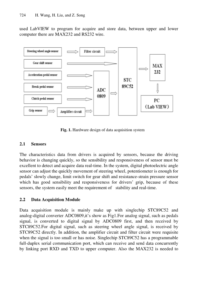 该系统由传感器,数据采集模块和上位机程序组成(如图1)。传感器包括方向盘传感器,踏板传感器,换档传感器和驾驶员手柄传感器。数据采集模块主要由单片机STC89C52和模数转换器ADC0809组成。上位机采用LabVIEW编程获取和存储数据,上下位机之间有MAX232和RS232线。