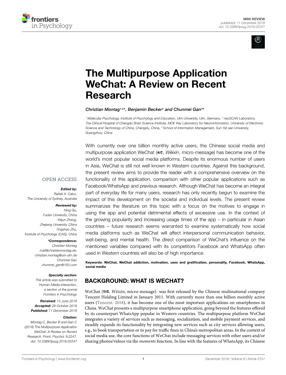 Abstract:With currently over one billion monthly active users, the Chinese social media and multipurposeapplication WeChat,hasbecomeoneofthe worldrsquo;s most popular social media platforms. Despite its enormous number of users in Asia, WeChat is still not well known in Western countries. Against this background, the present review aims to provide the reader with a comprehensive overview on the functionality of this application, comparison with other popular applications such as Facebook/WhatsApp and previous research. Although WeChat has become an integral part of everyday life for many users, research has only recently begun to examine the impact of this development on the societal and individual levels. The present review summarizes the literature on this topic with a focus on the motives to engage in using the app and potential detrimental effects of excessive use. In the context of the growing popularity and increasing usage times of the app – in particular in Asian countries – future research seems warranted to examine systematically how social media platforms such as WeChat will affect interpersonal communication behavior, well-being, and mental health. The direct comparison of WeChatrsquo;s influence on the mentioned variables compared with its competitors Facebook and WhatsApp often used in Western countries will also be of high importance.