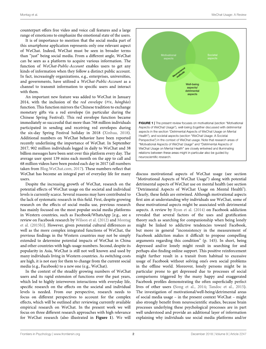 在过去几年中微信用户数量稳步增长及其功能快速扩展的背景下,导致与日常生活高度交织的互动,需要对社会和个人层面的影响进行具体研究。从我们的角度来看,研究需要关注不同的观点来解释复杂的影响,这将在回顾目前可用于微信的实证研究之后进行概述。在目前的工作中,我们将重点关注与微信研究高度相关的三种不同的研究方法(如图1所示))。我们将讨论微信使用的动机方面(参见“微信用法的动机方面”)以及微信用于心理健康的潜在有害方面(参见“微信用法对心理健康的不利方面”一节)。显然,这些领域是纠缠在一起的。虽然动机方面首先旨在了解个人使用微信的原因,但其中一些动机方面可能与有害方面有关。Ryan等人的评论。(2014)在Facebook成瘾上透露,使用和满足理论的几个因素,例如在孤独时寻找陪伴可能与Facebook的成瘾倾向有关,但更多的一般“Facebook成瘾测量的不一致使得很难提出令人信服的论据这种情况“(第145页)。简而言之,沮丧和/或孤独可能会导致搜索并可能也找到在线支持。这种积极的强化可能会进一步导致从习惯性过度转向过度使用Facebook而不解决线下世界中自己的社会问题。此外,Song等,2014 ; Tandoc等,2015)。社交媒体使用的动机/福祉/有害领域的研究 - 在目前的情况下微信 - 也可能从神经科学研究中获益,因为这些心理过程背后的大脑过程部分得到了很好的理解,并提供了额外的信息层解释为什么个人使用社交媒体平台和/或发展成瘾倾向(Montag等,2017)。因此,本综述还介绍了微信使用/成瘾的初步神经科学研究结果。最后,如图1所示本综述还提供了一些关于微信使用对社会层面影响的初步见解(参见“微信用法:社会视角”一节),然后简要介绍未来的研究问题。