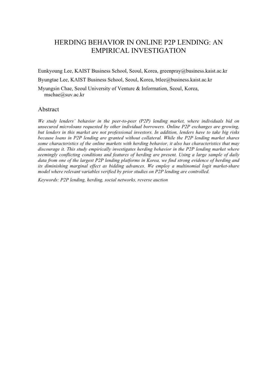 摘要:我们研究贷款人在(P2P)贷款市场上的行为,个人投标其他个人借款人要求的无保小额贷款。在线P2P交流正在增长,但这个市场的贷款人并不是专业的投资者。此外,贷款人必须承担很大的风险。因为P2P借贷贷款没有抵押品。而P2P借贷市场份额一些网络市场的特点与放牧行为,它也具有可能的特点不鼓励这项研究经验性地调查了P2P贷款市场中的放牧行为存在看似矛盾的条件和放牧的特征。每天使用大量样品来自韩国最大的P2P借贷平台之一的数据,我们发现有很强的放牧证据随着招标进展,边际效应逐渐减弱。我们采用多项Logit模型,通过对P2P借贷的先前研究进行验证的相关变量进行控制。