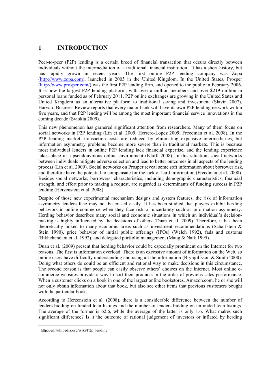 在提出请求之前的力量和努力被认为是P2P中资助成功的决定因素贷款(Herzenstein et al。2008)。尽管有这些新的实验机制设计和系统特征,信息的风险不对称贷款人的面孔可能不会轻易抹去。已经研究了玩家展示放牧当网络商务面临诸如信息不对称等不确定性的风险时,其行为。羊群行为描述了个人决策的许多社会和经济情况受到他人决定的高度影响(Duan et al。2009)。因此,一直以来理论上与许多经济领域有关,如投资建议(Scharfstein&Stein 1990),首次公开募股(IPO)的价格行为(Welch 1992),时尚潮流(Bikhchandani等人,1992)和委托投资组合管理(Maug&Naik,1995)。段等(2009)提出,放牧行为在互联网上尤为突出原因。第一个是信息超载。网络上有大量的信息,所以在线用户难以理解和使用所有的信息(Brynjolfsson&Smith 2000)。做别人做的事情可能是在这种情况下做出决定的有效合理的方式。第二个原因是人们可以轻松地在互联网上观察别人的选择。大多数在线电子商务网站提供了按照先前销售业绩排序的方式对产品进行排序。当客户点击一家最大的在线书店之一的Amazon.com,他或她就会不仅可以获取有关该书的信息,还可以查看以前客户购买的其他项目与特定的书。根据Herzenstein等(2008),数量之间有很大的差距