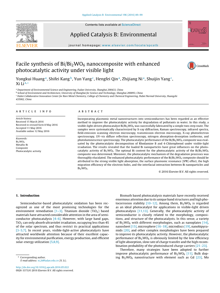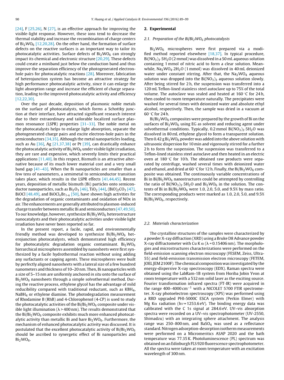 在过去十年中,等离子体激元贵金属在其界面上形成肖特基结的光催化剂表面沉积已经引起了重大的研究兴趣,由于它们非凡而可定制的局部表面等离子体共振(LSPR)性质[31] -33]。光催化剂上的贵金属有助于增加光吸收,分离光生电荷对并激发半导体中的电子 - 空穴对[34,35]。虽然Au [36],Ag [21,37,38]或Pt [39]等金属纳米粒子的负载量可以显着增强Bi2WO6在可见光照射下的光催化活性,但它们是罕见且昂贵的,这严重限制了它们实际应用[11,40]。在这方面,铋是一种有吸引力的替代品,因为它的材料成本低得多,带隙很小[41-43]。当Bi纳米颗粒小于几十纳米时,发生半金属到半导体转变,这导致了LSPR的影响[41,44,45]。近年来,金属铋(Bi)颗粒沉积到半导体纳米颗粒上,如Bi2O3 [46],TiO2 [44],(BiO)2CO3 [47],BiOCl [48,49]和BiOClxBr1-x [50]已经显示出有机污染物降解和NOx在空气中氧化的高活性。增强通常归因于金属Bi和半导体之间的等离子体诱导电荷转移[47,49,50]。然而,据我们所知,在可见光照射下合成Bi/Bi2WO6异质结构纳米催化剂及其光催化活性迄今尚未见报道。