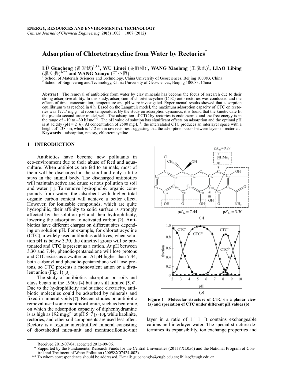 摘要:由于粘土矿物具有很强的吸附能力,并且从水中去除抗生素已成为研究的重点。因此本次实验研究了CTC在累托石上的吸附效果,并考察了时间、浓度、温度和pH对吸附效果的影响。实验结果表明,累托石对于CTC的吸附在8小时内就达到吸附平衡,室温下,在Langmuir模型的基础上,累托石对CTC的最大吸附能力为177.7mg/g。通过对吸附动力学的研究,动力学符合伪二级动力学模型。累托石对CTC的吸附过程是吸热过程,自由能在10-30KJ/mol的范围内。溶液的pH值对吸附效果有显著影响,最佳pH值是在酸性条件下(pH2-6)。在CTC为2500 mg/L的浓度下,进入到累托石中的CTC会产生一层厚度为1.38 nm的夹层空间,在原始的累托石中这个夹层空间为1.12 nm,这表明吸附发生在累托石的各层之间。