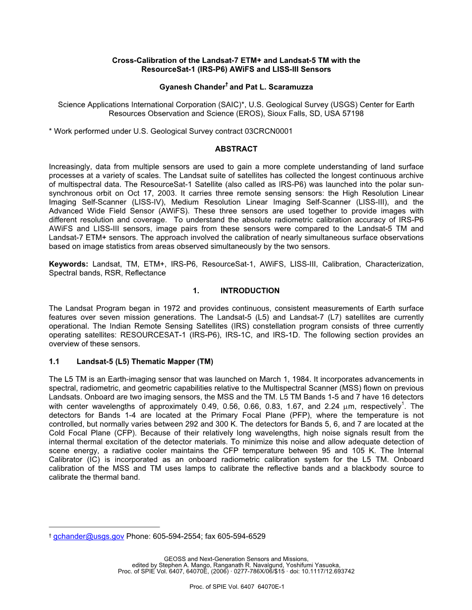 关键词:Landsat,TM,ETM ,IRS-P6,ResourceSat-1,AWiFS,LISS-III,校准,表征,光谱带,RSR,反射率