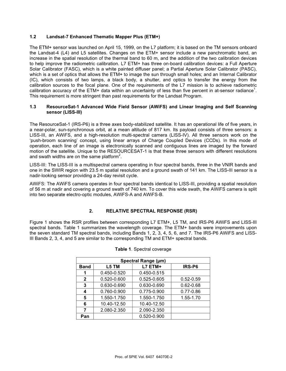 图1显示了相应的L7 ETM ,L5 TM和IRS-P6AWiFS与LISS-III光谱带之间的RSR曲线。表1总结了波长范围。