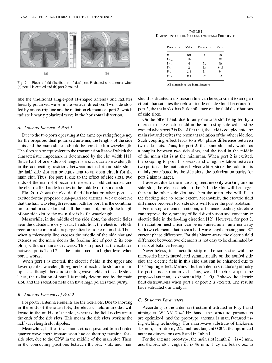 图2.当(a)端口1被激励和(b)端口2被激励时,双端口H形缝隙天线的电场分布