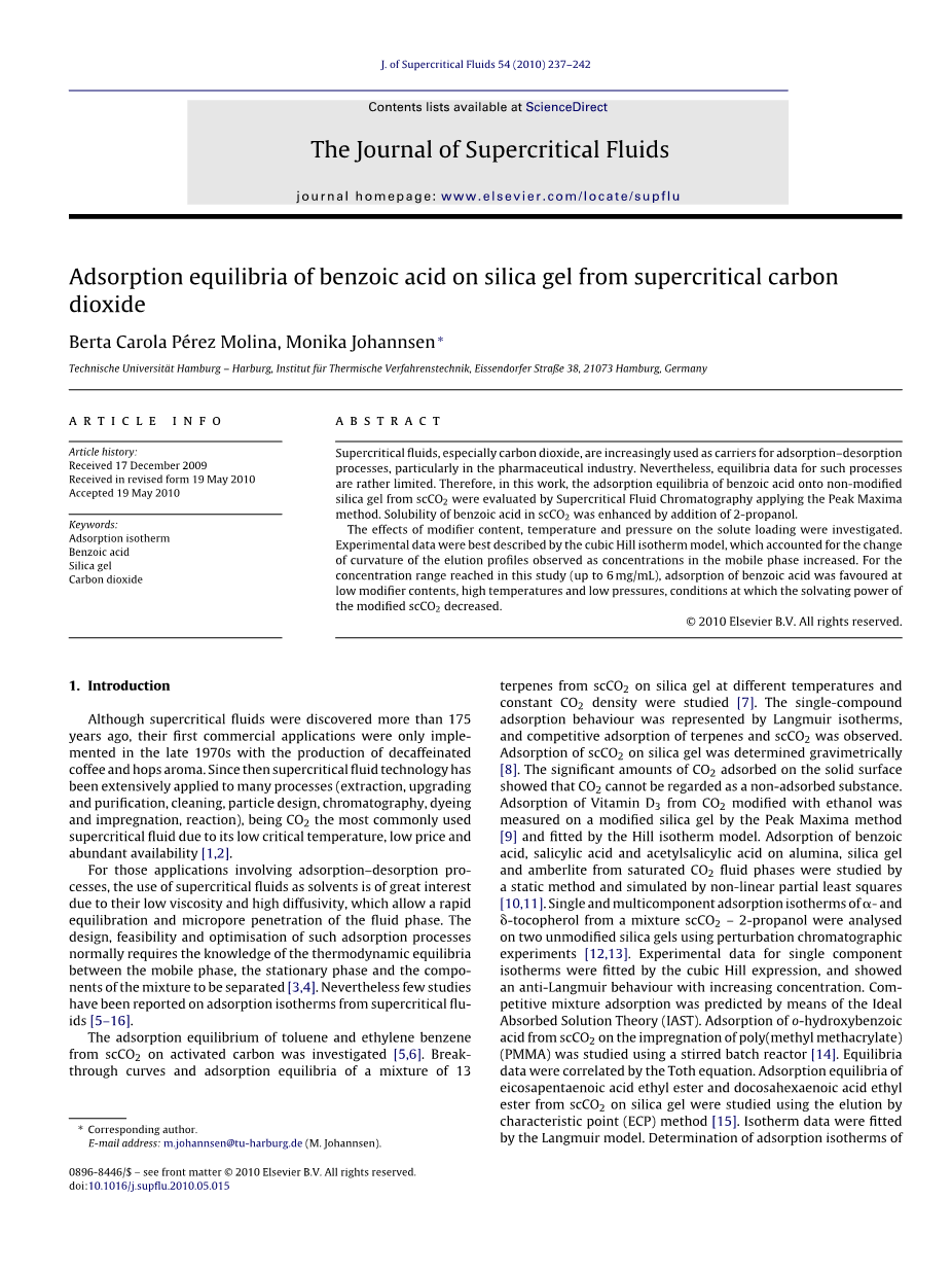 超临界碳在硅胶上吸附苯甲酸的平衡二氧化物