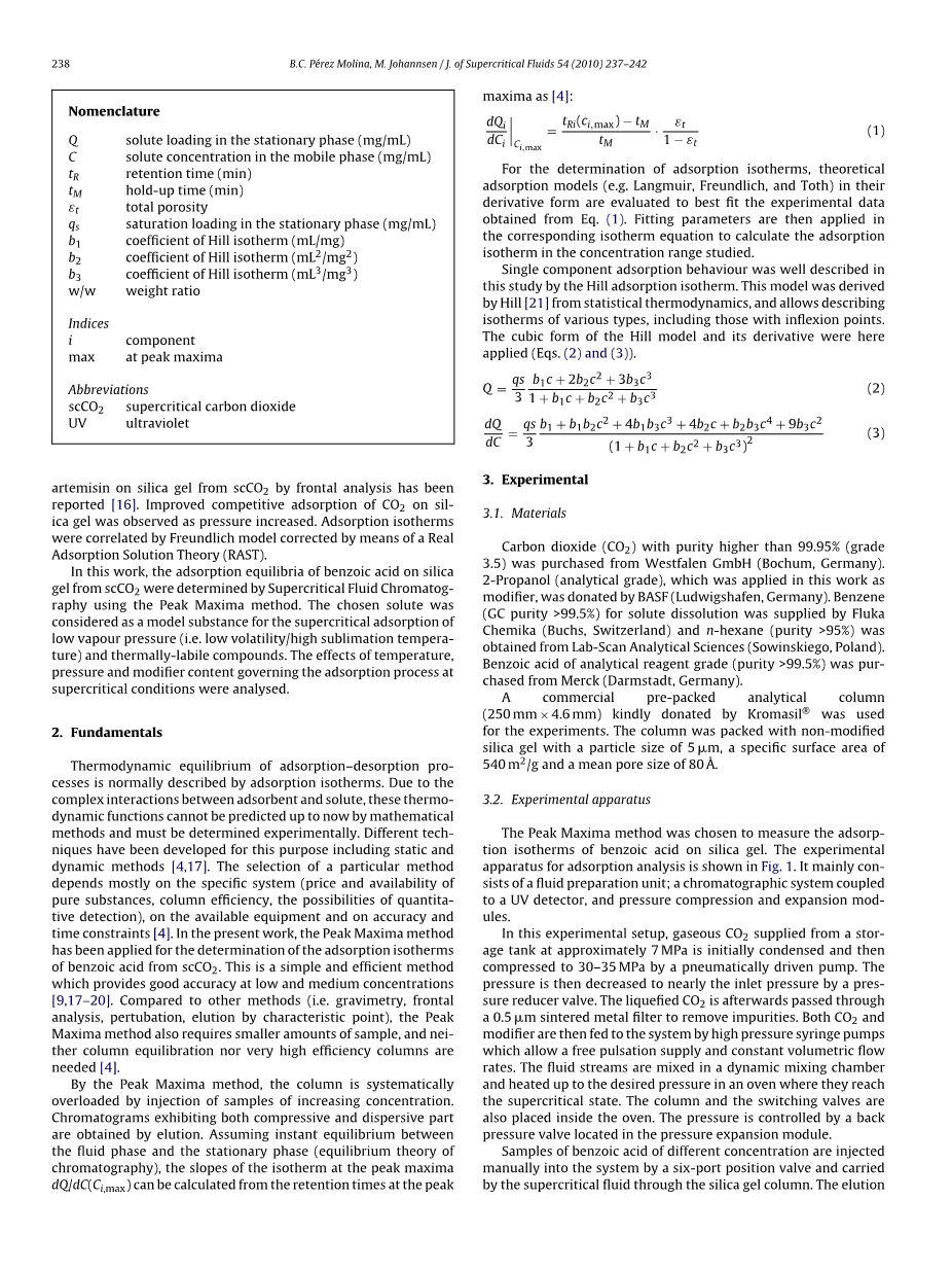 摘要;超临界流体,特别是二氧化碳,越来越多地被用作吸附-解吸过程的载体,特别是在制药工业中。然而,这种过程的平衡数据是相当有限的。因此,在这项工作中,用超临界流体色谱法,用峰极大值法评价苯甲酸在SCCO2中的非平衡硅胶上的吸附平衡。添加2-丙醇提高了苯甲酸在SCCO2中的溶解度。研究了改性剂含量、温度和压力对溶质负荷的影响,实验数据用立方Hill等温模型进行了最好的描述,该模型解释了随着流动相浓度的增加,洗脱曲线的曲率变化。对于本研究中达到的浓度范围(高达6mg/ml),苯甲酸的吸附在低改性剂含量、高温和低压力下有利于,改性SCCO2的溶剂化能力降低。