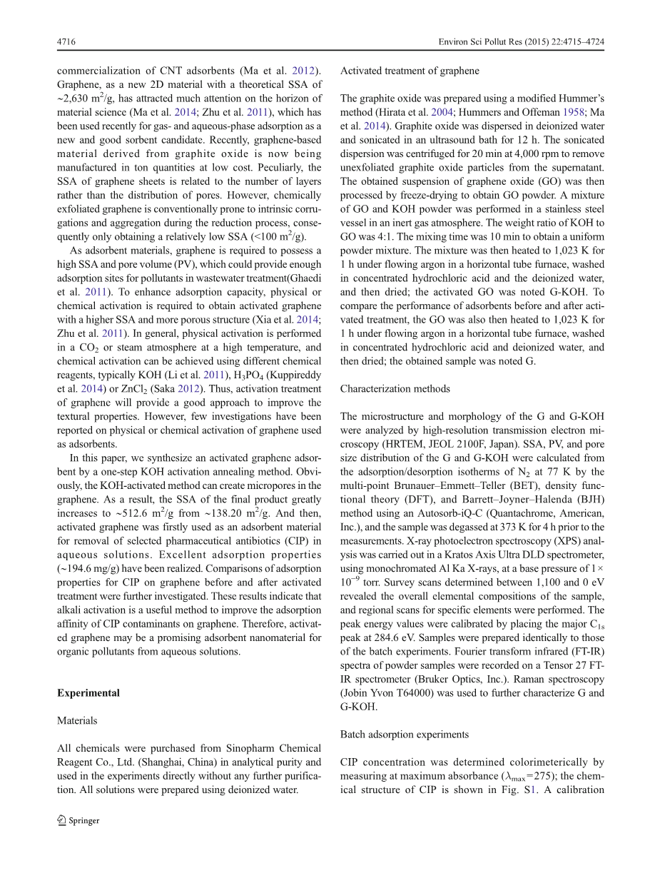 作为一种吸附剂材料,石墨烯需要具备较高的SSA和孔隙体积(PV),为处理污水中的污染物提供足够的吸附点(Ghaedi et al. 2011)。为了提高吸附能力,需要采取物理或化学活化来获得具有更高SSA和更多孔结构的石墨烯(Xia et al. 2014; Zhu et al. 2011)。一般来说,物理活化是在CO2或者高温蒸汽中进行的,化学活化石需要使用不同的化学试剂,通常是 KOH (Li et al. 2011), H3PO4 (Kuppireddy et al. 2014) 或者ZnCl2 (Saka 2012)。因此,对石墨烯进行活化处理可以为改善金属结构提供一个很好的方法。但是,很少有关于将物理或化学活化的石墨烯作为吸附材料的研究。
