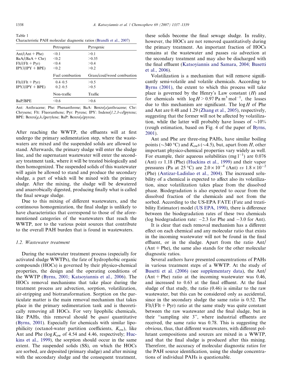关于利用污水污泥中多环芳烃分子诊断比值了解多环芳烃来源的适当性讨论