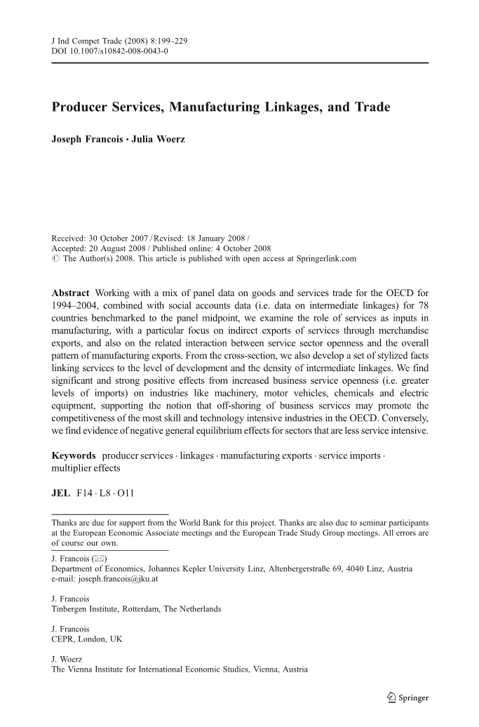 摘要:抽象处理的面板数据对货物和服务贸易对1994 - 2004年经济合作与发展组织(OECD),结合社交账户数据(即数据中间联系)78年国家基准测试面板中点,我们检查服务作为输入的角色在制造业,主要侧重于间接通过商品出口的出口服务,以及相关的服务业开放和相互作用整体制造业出口的模式。从横截面来看,我们还开发了一组程式化的事实,将服务与开发水平和中间链接的密度联系起来。我们发现明显和强烈的积极作用增加业务服务开放(即更高层次的进口)等产业机械、汽车、化工和电力设备,支持认为离岸外包业务服务可以促进最技巧和技术密集型产业的竞争力在经合组织。相反,我们发现服务密集程度较低的部门存在负一般均衡效应的证据。